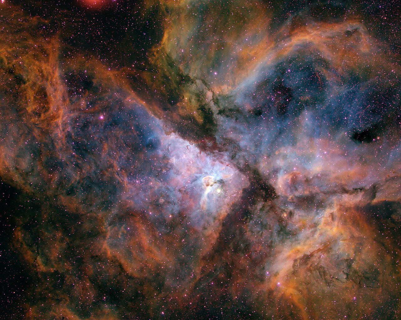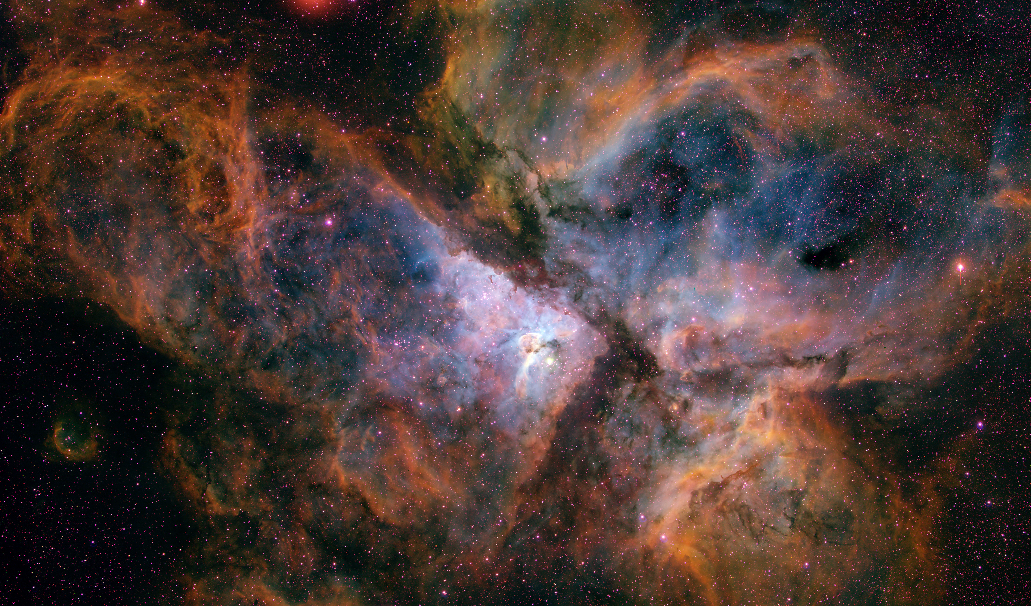 This image shows a ground-based view of the giant star-forming region in the southern sky known as the Carina Nebula, combining the light from three different filters tracing emission from oxygen (blue), hydrogen (green), and sulphur (red). The colour is also representative of the temperature in the ionised gas: blue is relatively hot and red is cooler.