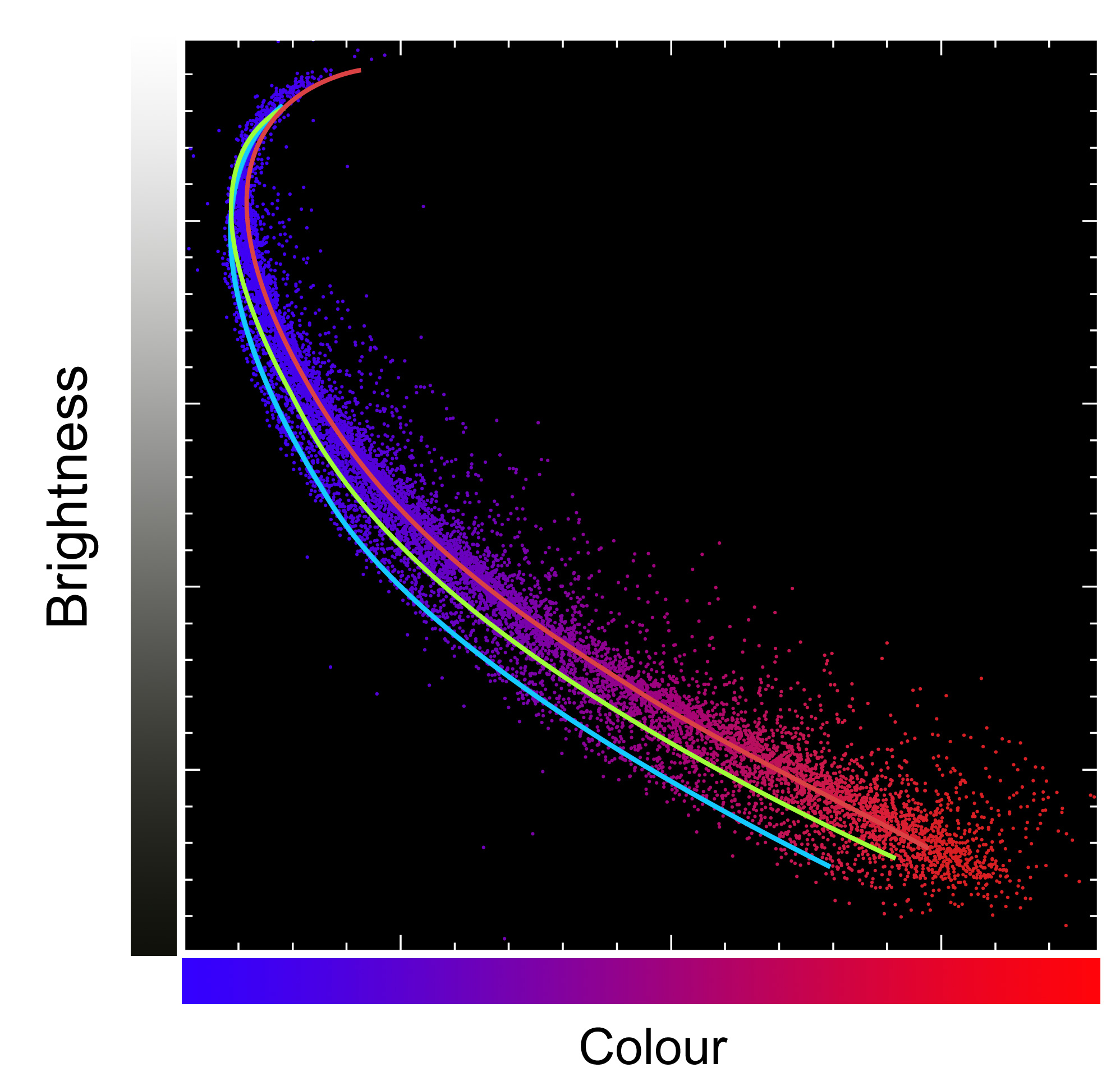 The three coloured curved lines, red, green and blue, represent the three different stellar generations that were discovered to be present in the globular cluster.