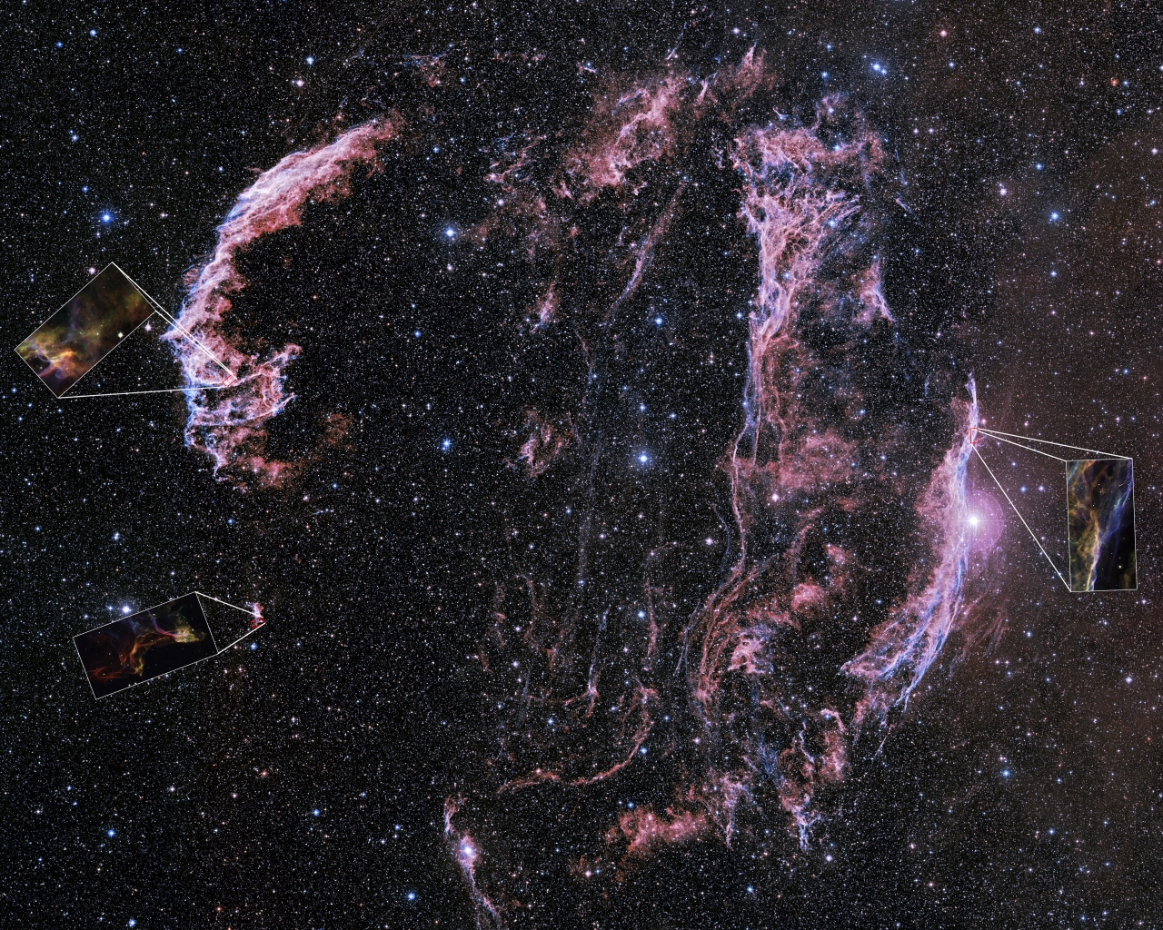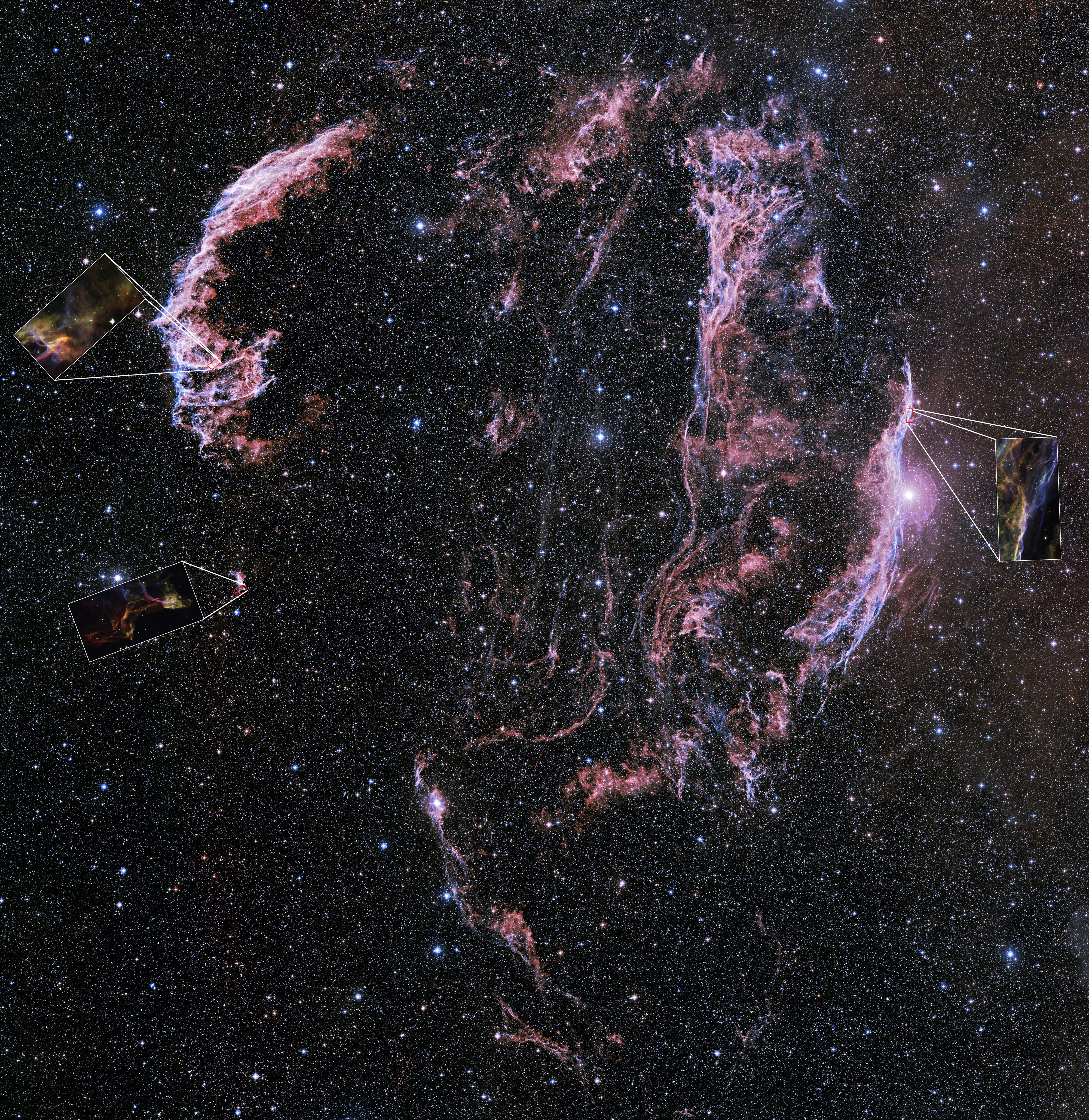 Wide-field ground-based photo of the Veil Nebula with WFPC2 insets