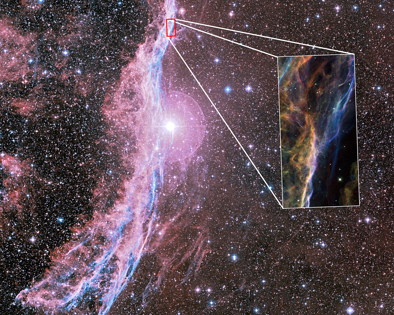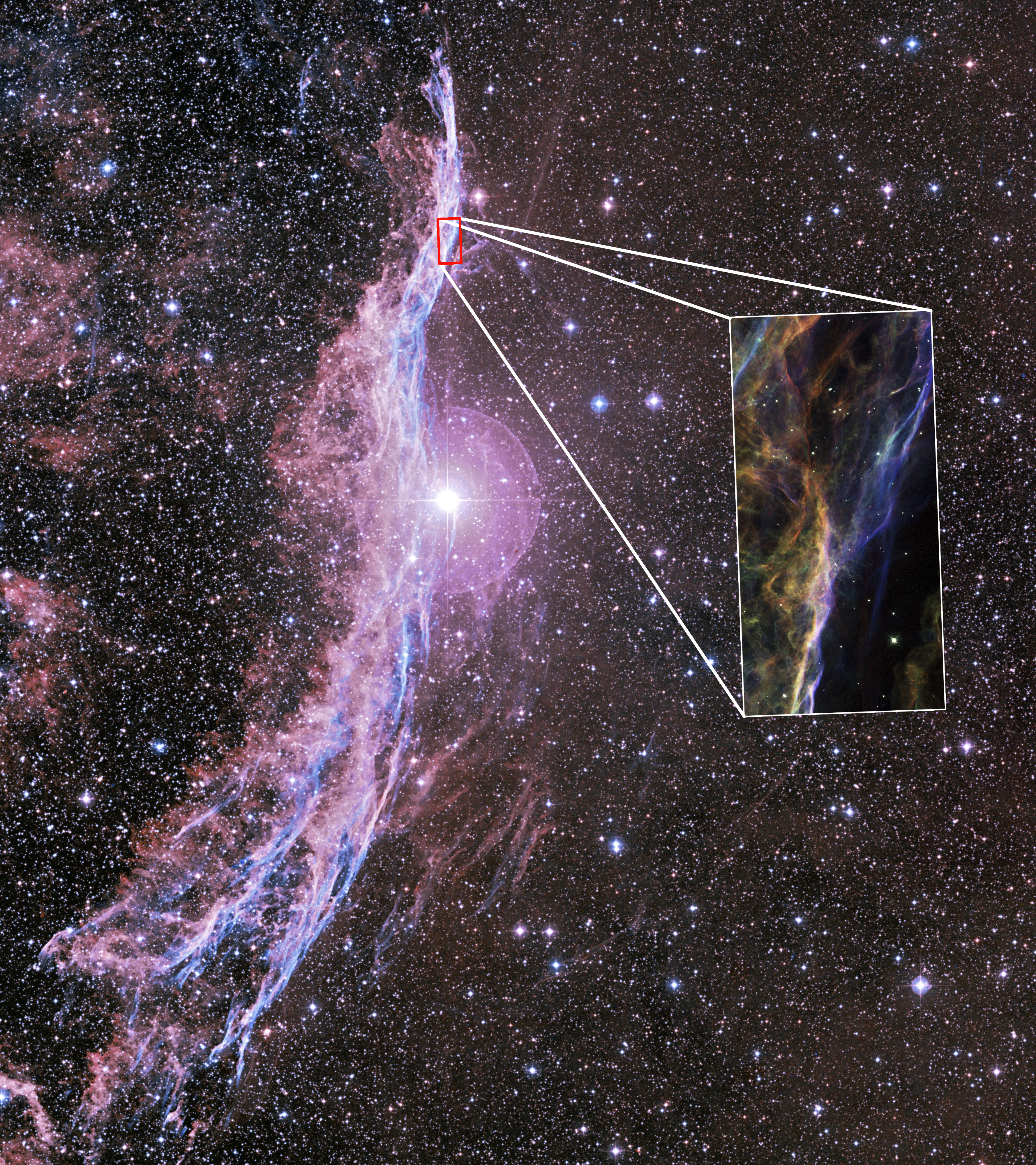 This image shows the west end of the Veil Nebula known as the Witch's Broom Nebula or NGC 6960. The central bright star is 52 Cygni. The highlighted portion is an image taken with the Wide Field and Planetary Camera 2 (WFPC2) on board the NASA/ESA Hubble Space Telescope (see related images).