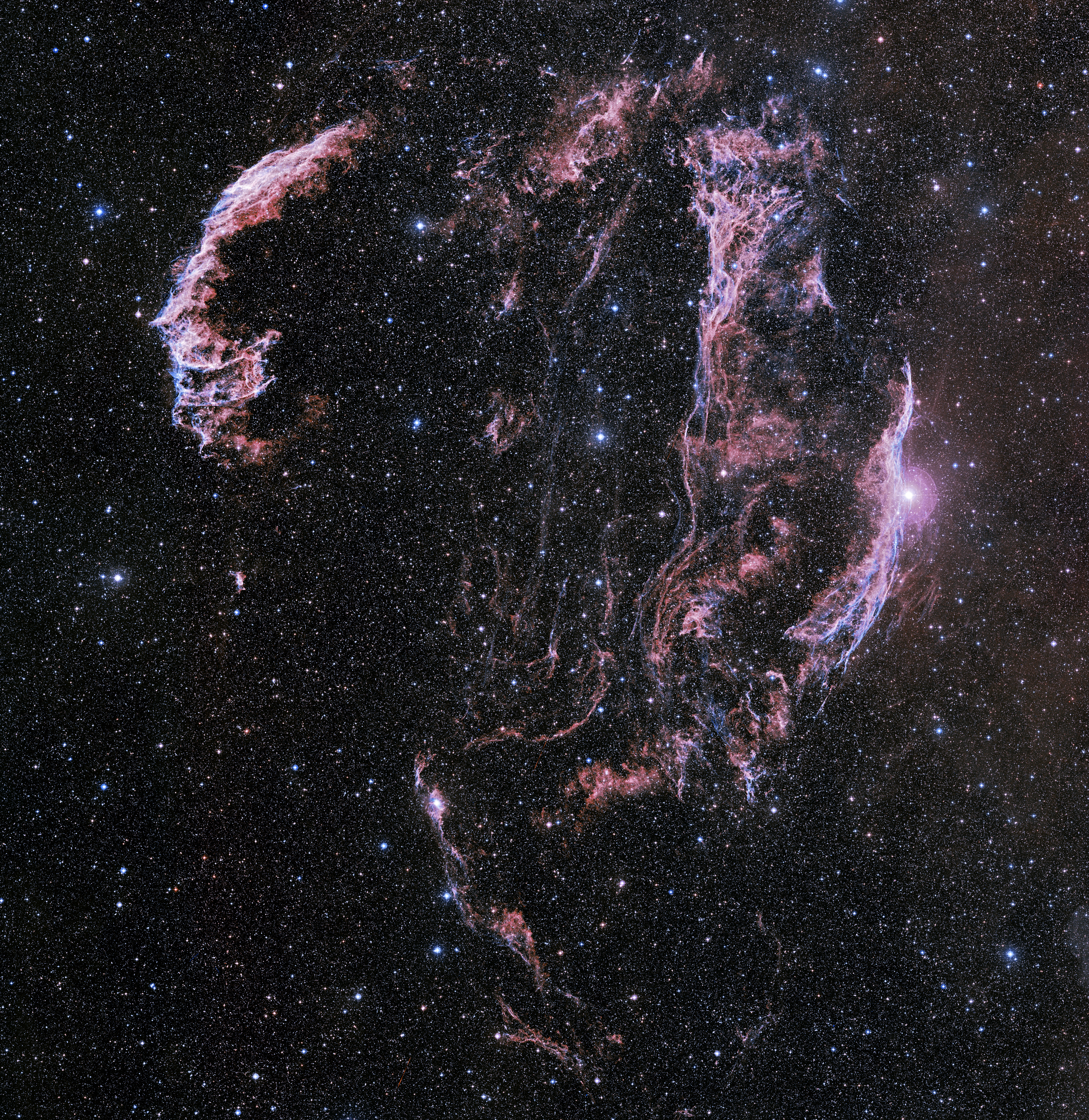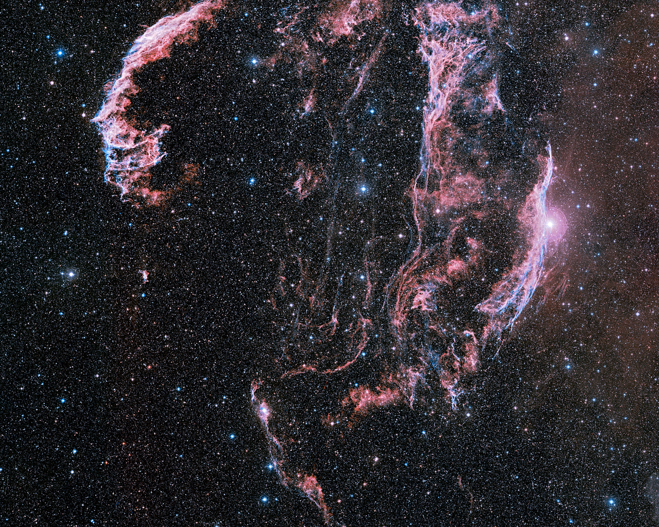 The Veil Nebula - also known as the Cygnus Loop - is a large structure subtending an angle of about 3° on the sky. The bright western edge (on the right in this view) is also known as NGC 6960, or the Witch's Broom Nebula. The bright eastern edge (top left in this image) consists of NGC6992 (top half) and NGC6995 (bottom half). The bright star at right centre is 52 Cygni.Last Update: 1 September 2019
