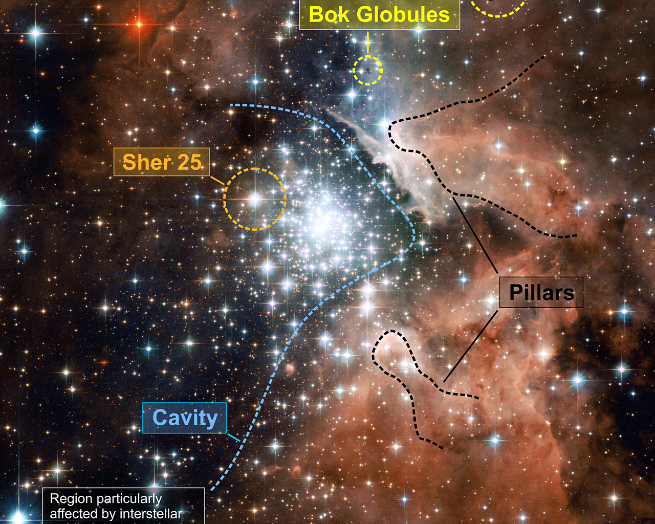 An annotated version of Hubble's image of a young star cluster in the star-forming region NGC 3603. The enormous cavity blown out by the young stars in the massive star cluster in NGC 3603's centre can be seen to the right of the cluster. Of particular interest is the lower left of the image. This is darker due to a mix of extinction of starlight and interstellar reddening caused by foreground dust clouds. Giant pillars of gas can also be seen extending away from the central cluster whilst the striking Bok Globules reside, silhouetted against the nebula, at the top right of the image.