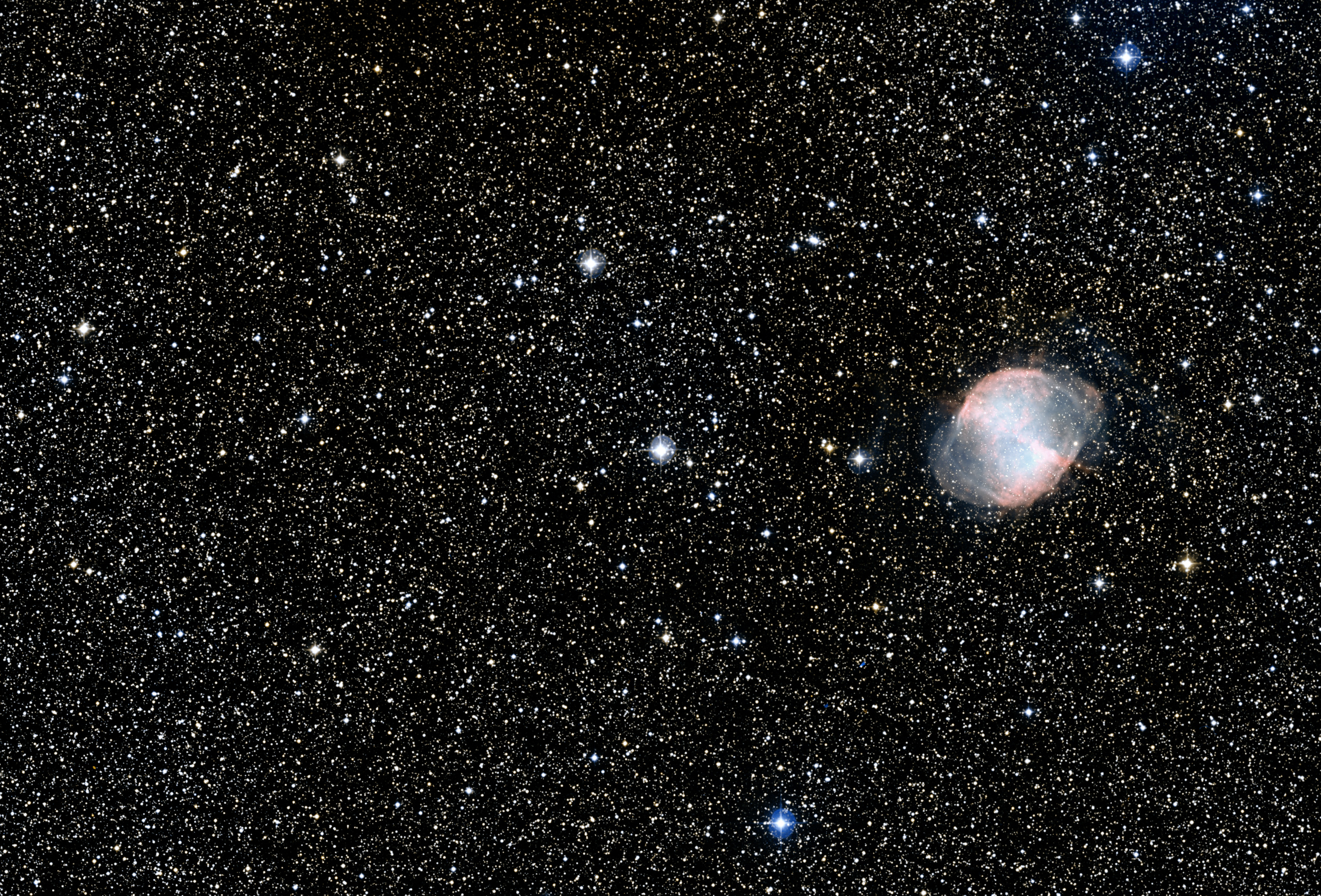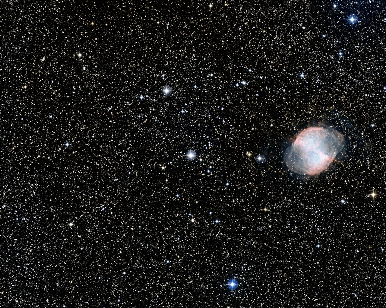 Ground-based image of the sky around the star HD 189733 (centre). The NASA/ESA Hubble Space Telescope has given astronomers a fascinating new insight into the atmosphere of the exoplanet HD 189733b in orbit around this star. The observations provide clear evidence of the presence of hazes in its atmosphere. To the right of the star is the notable planetary nebula Messier 27. The field-of-view is approximately 0.9° × 0.6° and is an excerpt from the Digitized Sky Survey 2.