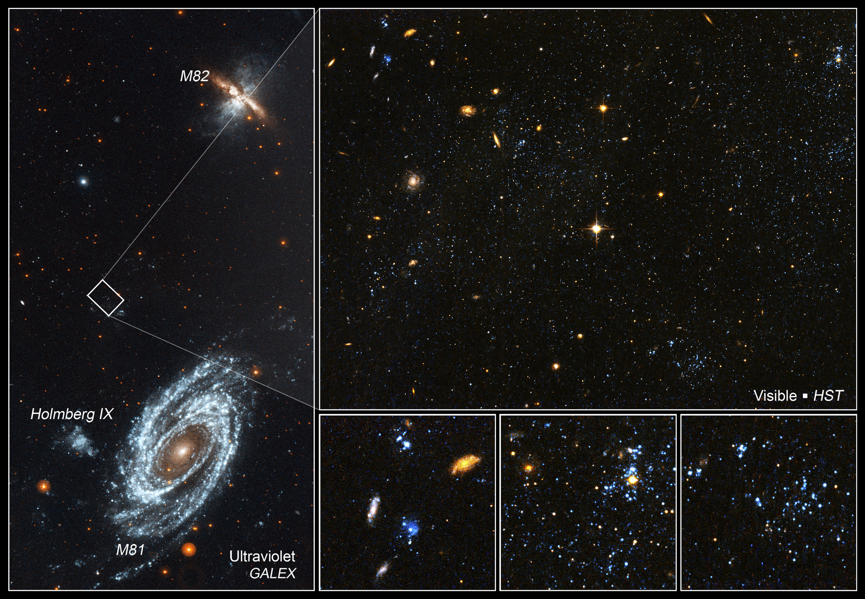 A GALEX ultraviolet image of the interacting galaxies M81 and M82, which lie 12 million light-years away in the constellation Ursa Major. The gravity from each galaxy dramatically affected the other during their last close encounter, 200 million years ago. Gas density waves rippling around M81 make it a grand design spiral. M82 is undergoing a starburst at its core, creating glowing fingers of hydrogen.