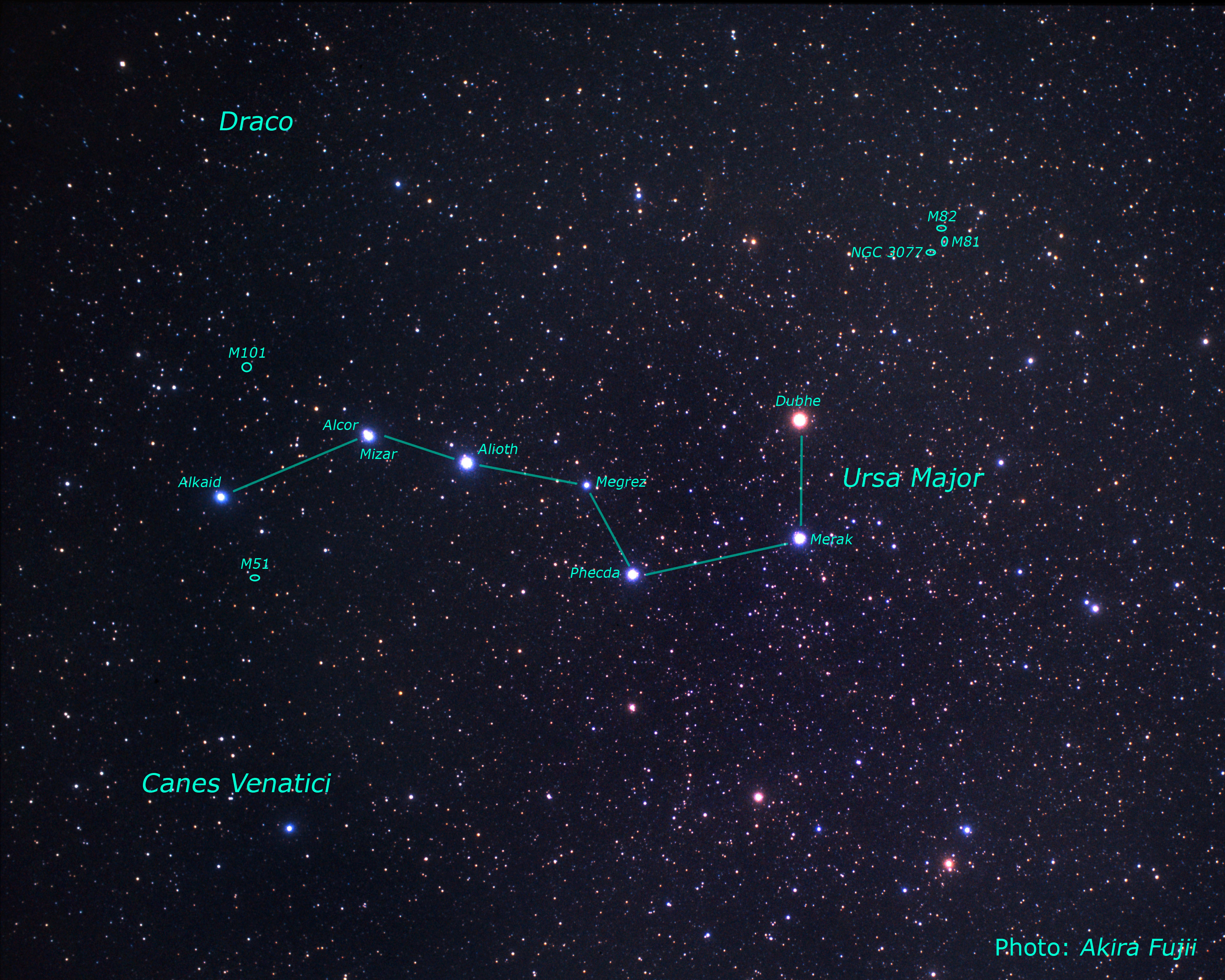 A wide-field view of the constellation of Ursa Major with the position of the M81/M82 galaxy group indicated at top right.