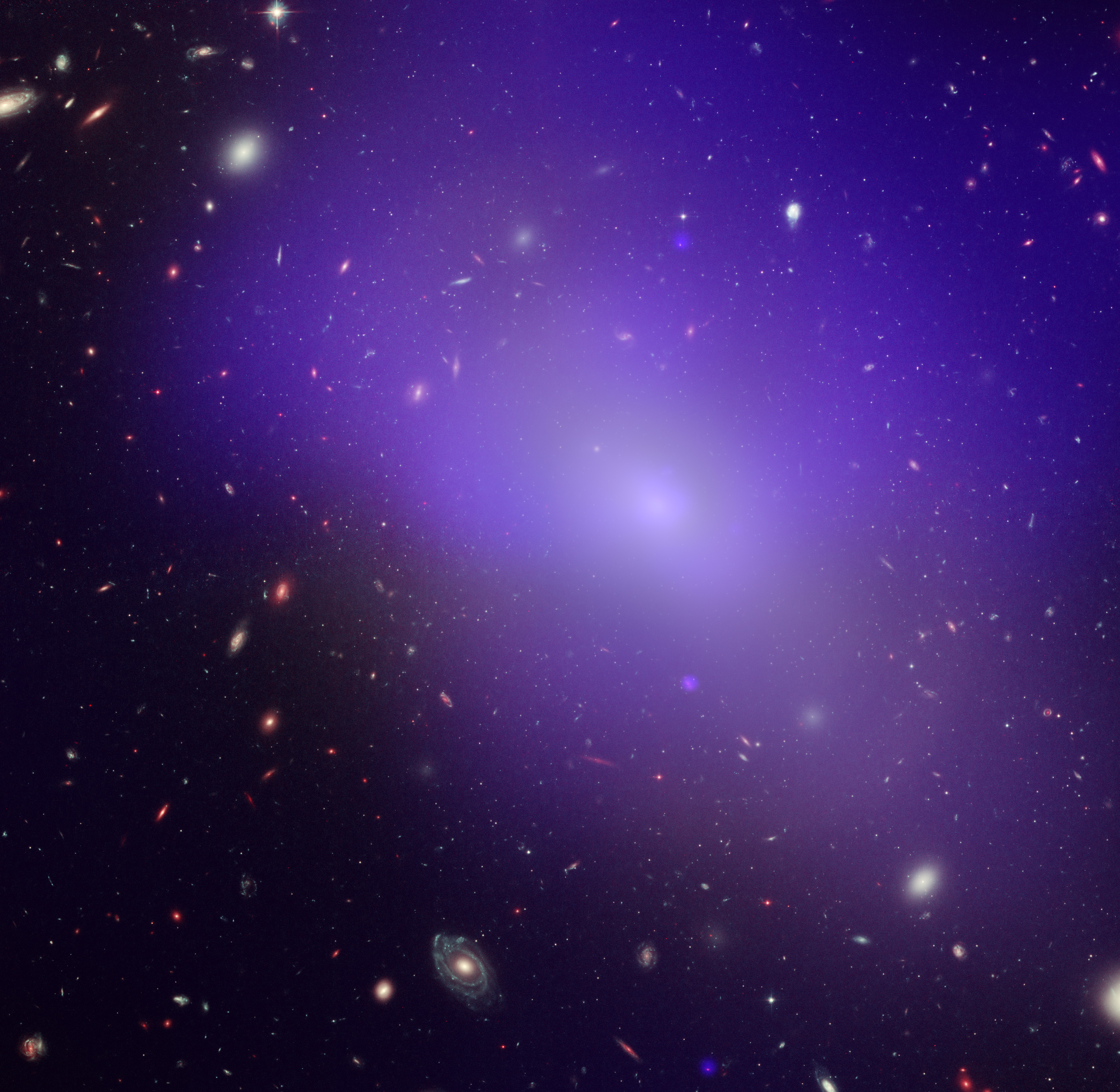 This image of the elliptical galaxy NGC 1132 combines an image from NASA's Chandra X-Ray Observatory obtained in 2004 with images from the NASA/ESA Hubble Space Telescope made in 2005 and 2006 in green and near-infrared light. The blue/purple in the image is the false-colour depiction of the measured X-ray glow from hot, diffuse gas. The giant foreground galaxy, numerous dwarf galaxies in its neighbourhood, and many much more distant galaxies in the background are seen in visible light.