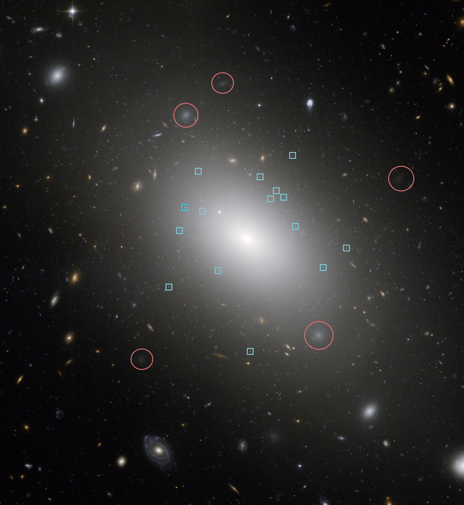 This Hubble image shows the giant elliptical galaxy NGC 1132 with annotations showing some of the surrounding dwarf galaxies (in red) and some of its numerous globular clusters (in blue).