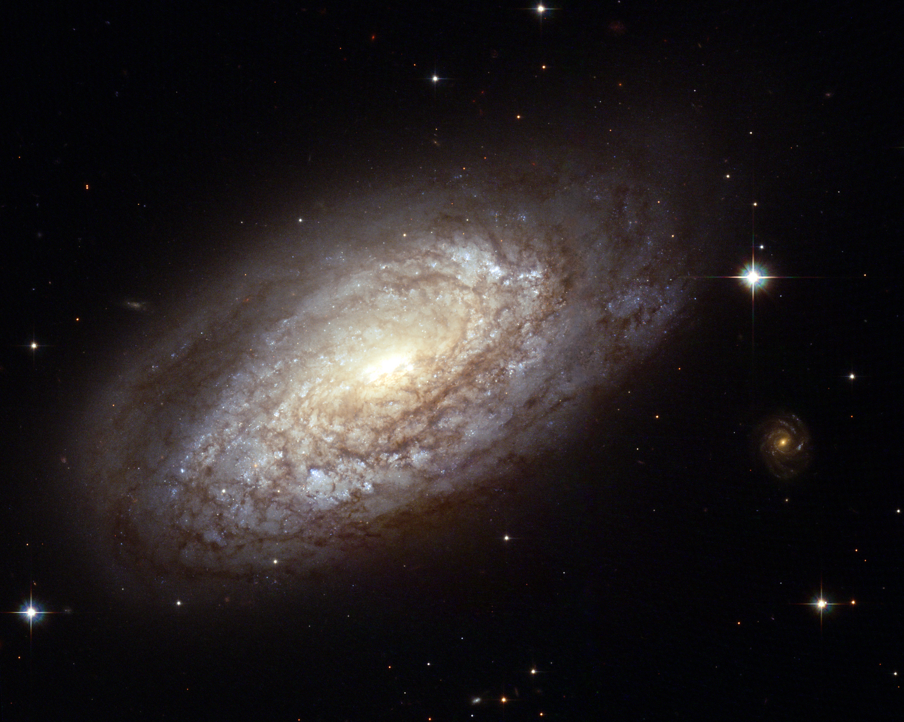 NGC 2397, pictured in this image from Hubble, is a classic spiral galaxy with long prominent dust lanes along the edges of its arms, seen as dark patches and streaks silhouetted against the starlight. Hubble's exquisite resolution allows the study of individual stars in nearby galaxies.