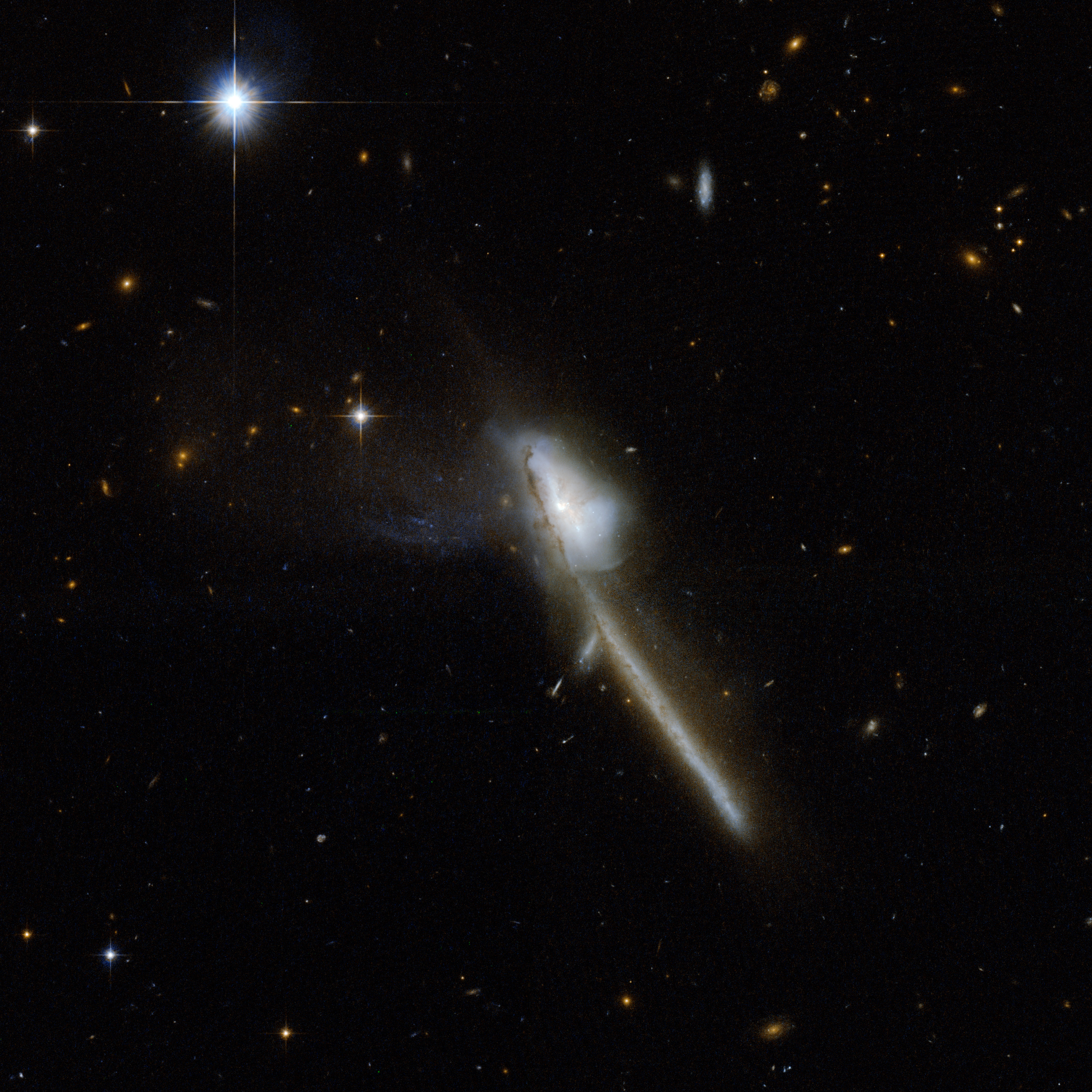 Markarian 273 is a galaxy with a bizarre structure. The Hubble image shows an intricate central region and a striking tail that extends diagonally towards the bottom-right of the image. The tail is about 130 thousand light-years long and is strongly indicative of a merger between two galaxies. Markarian 273 has an intense region of starburst, where 60 solar masses of new stars are born each year. Near-infrared observations reveal a nucleus with two components. Markarian 273 is one of the most luminous galaxies when observed in the infrared, and is located 500 million light-years away from Earth.