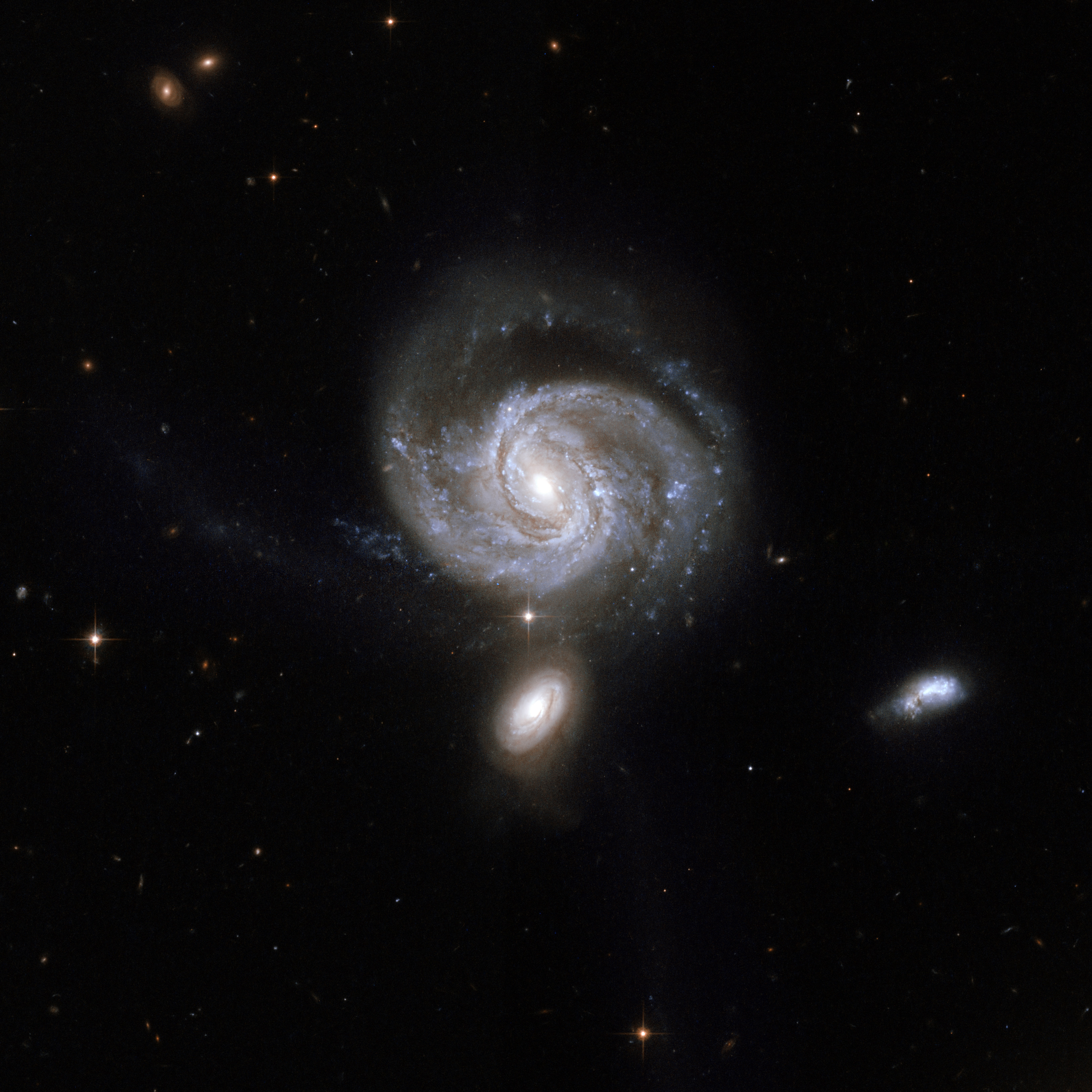 NGC 7674 (seen just above the centre), also known as Markarian 533, is the brightest and largest member of the so-called Hickson 96 compact group of galaxies, consisting of four galaxies. This stunning Hubble image shows the spiral galaxy nearly face-on. The central bar-shaped structure is made up of stars. The shape of NGC 7674, including the long narrow streamers seen to the left of and below the galaxy can be accounted for by tidal interactions with its companions.