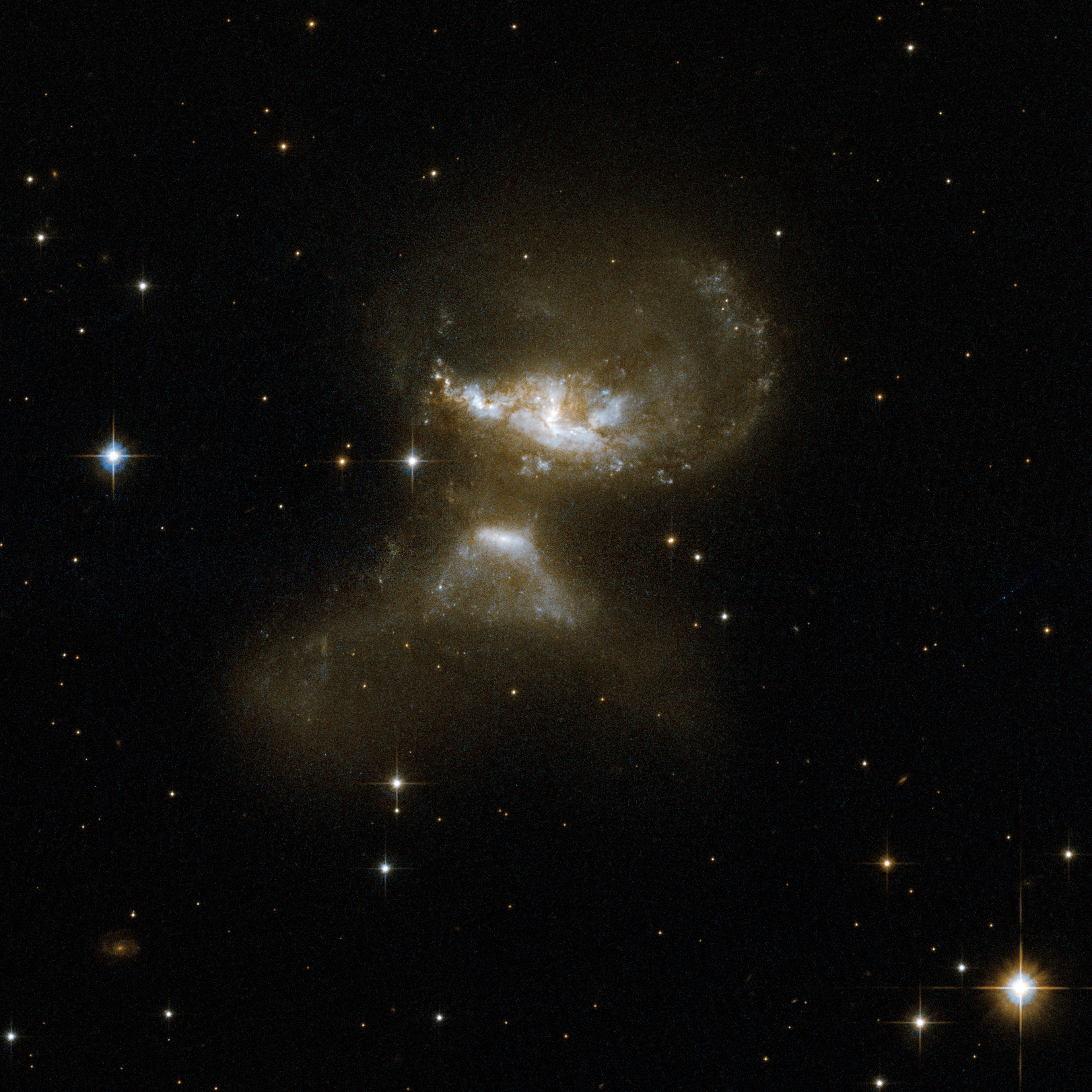 MCG+12-02-001 consists of a pair of galaxies visibly affected by gravitational interaction as material is flung out in opposite directions. A large galaxy can be seen in the upper half of the frame and a smaller galaxy resembling an erupting volcano is in the lower half. The bright core of this galaxy emerges from the summit of the "volcano".