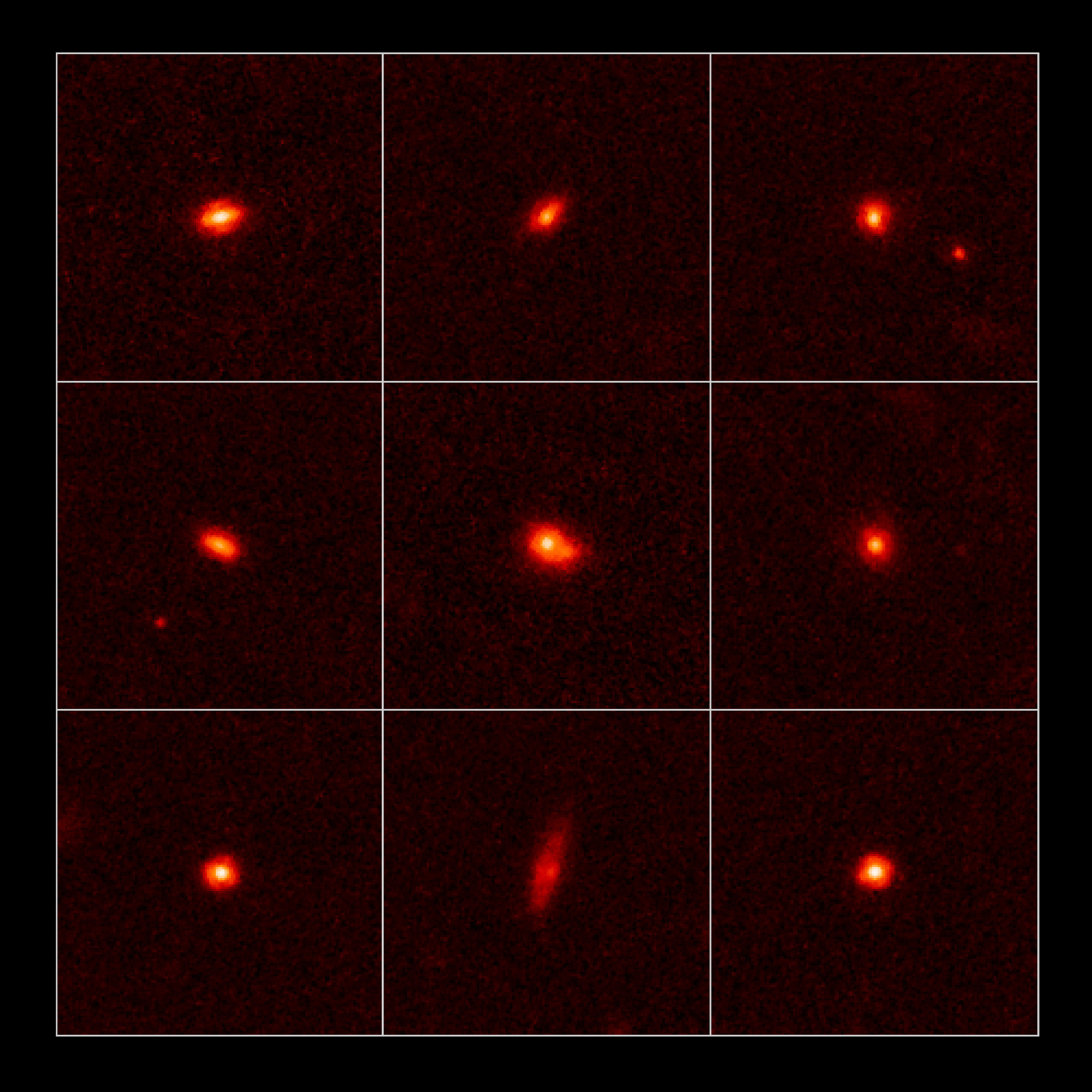 These images obtained with the NASA/ESA Hubble Space Telescope show nine compact, ultra-dense galaxies as they appeared 11 thousand million years ago.