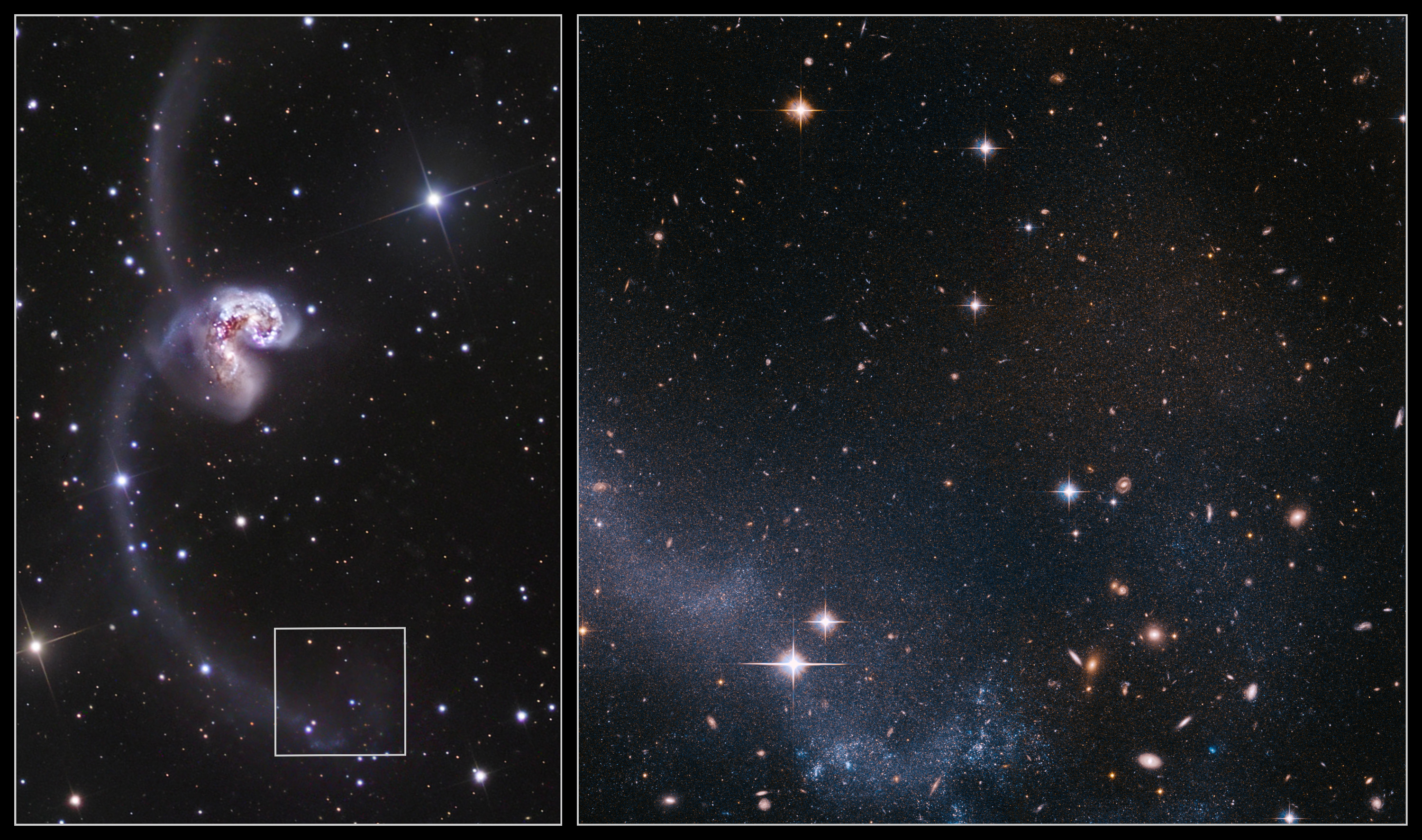 The Hubble Advanced Camera for Surveys image (right) shows a portion of the southern tidal tail. The main visible component consists of young blue stars recently formed out of the gas accumulating along the spine of the tail, and many red background galaxies can also be seen. The region is also filled by thousands of faint red stars, just visible when zooming in on the image.