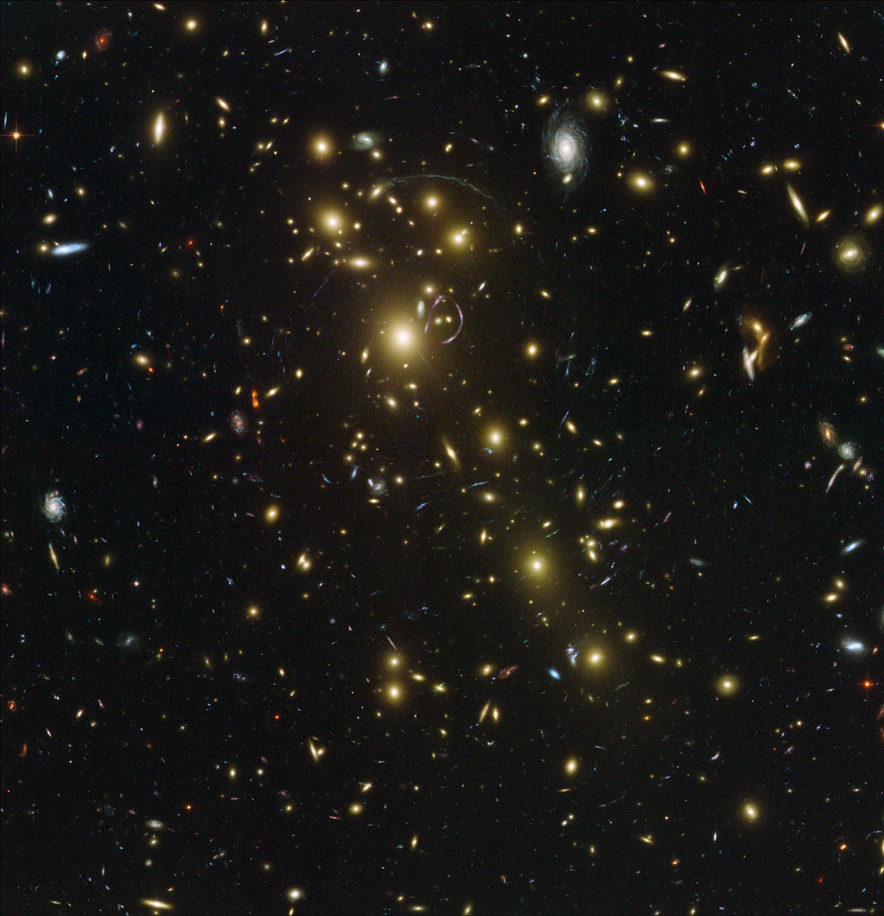 Located in the northern celestial hemisphere, Abell 1703 is composed of over one hundred different galaxies that act as a powerful cosmic telescope, or gravitational lens. The gravitational lens produced by the massive galaxy cluster in the foreground (the yellow mostly elliptical galaxies scattered across the image) bends the light rays in a way that can stretch the images and so amplify the brightness of the light rays from more distant galaxies. In the process it distorts their shapes and produces multiple banana-shaped images of the original galaxies. The result is the stunning image seen here - a view deeper into the Universe than possible with current technology alone. Abell 1703 is located at 3 billion light-years from the Earth (redshift 0.26).