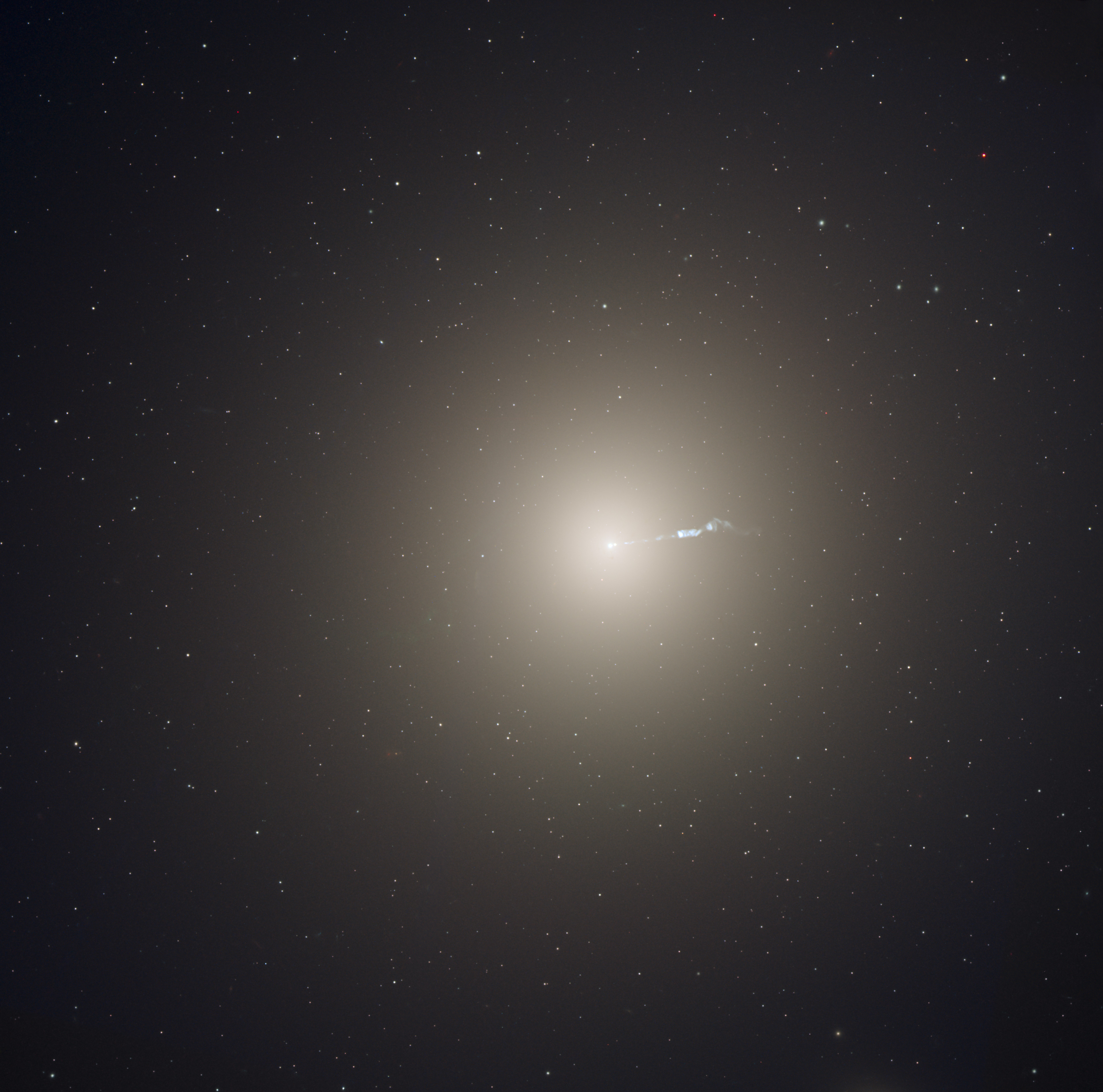 Amid the smooth yellow population of older stars, the two features that stand out most in this Hubble Space Telescope image of M87 are its soft blue jet and the myriad of starlike globular clusters scattered throughout the image.