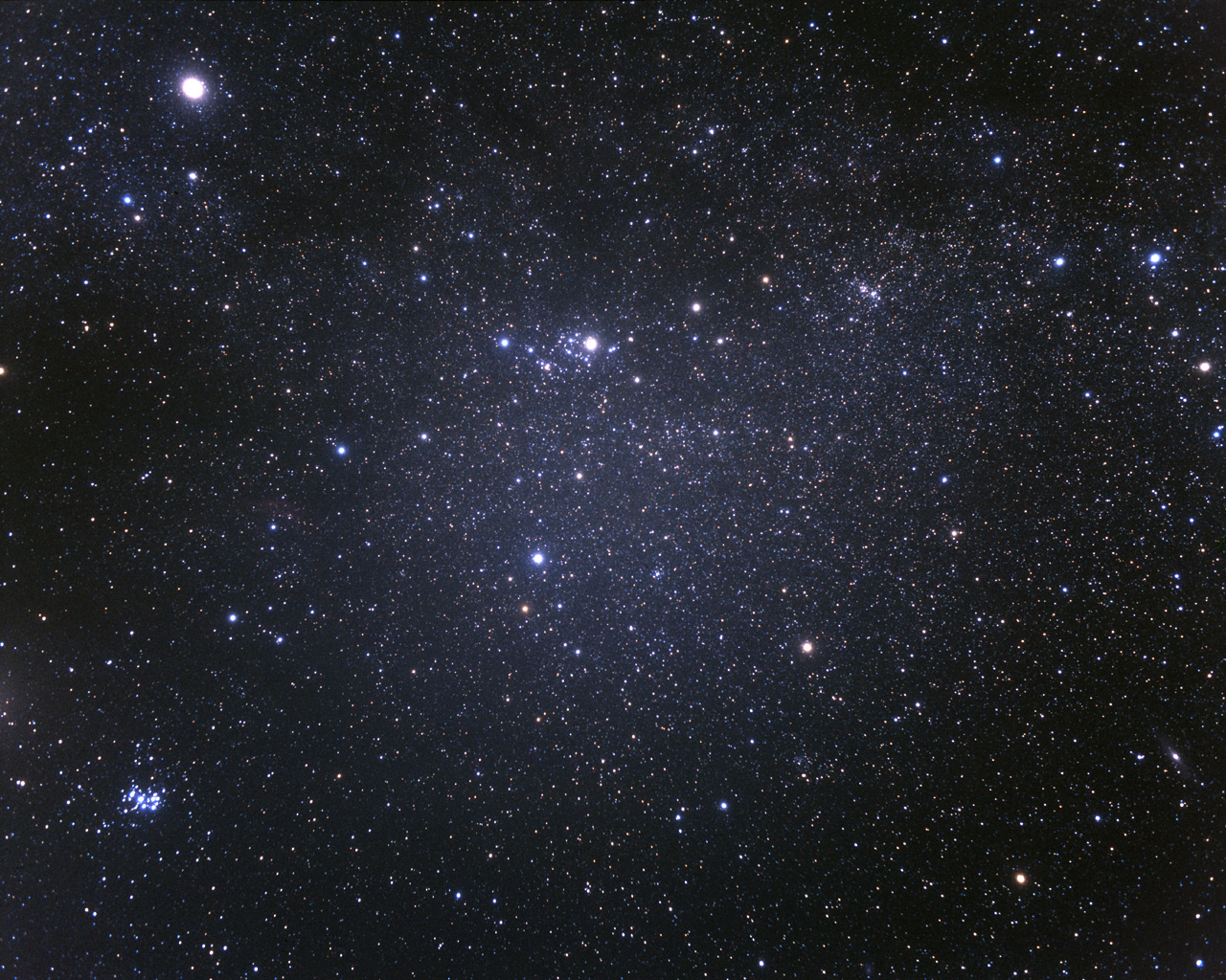 The Perseus cluster of galaxies (including active galaxy NGC 1275) lies in the constellation Perseus, the Hero. Although NGC 1275 is the brightest galaxy in the Perseus cluster of galaxies, professional equipment is required to see it in any detail. However, even naked eye observers can see the Pleiades open star cluster in the neighbouring Taurus constellation (in the bottom left of the image) on a clear night.