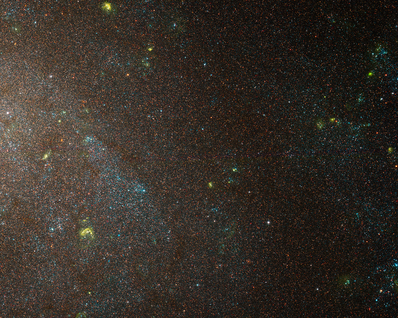 In this view of the spiral galaxy NGC 300, young, blue stars are concentrated in spiral arms that sweep diagonally through the image. The yellow blobs are glowing hot gas that has been heated by radiation from the nearest young, blue stars. NGC 300 is a member of the Sculptor Group of galaxies and it is located 7 million light-years away.