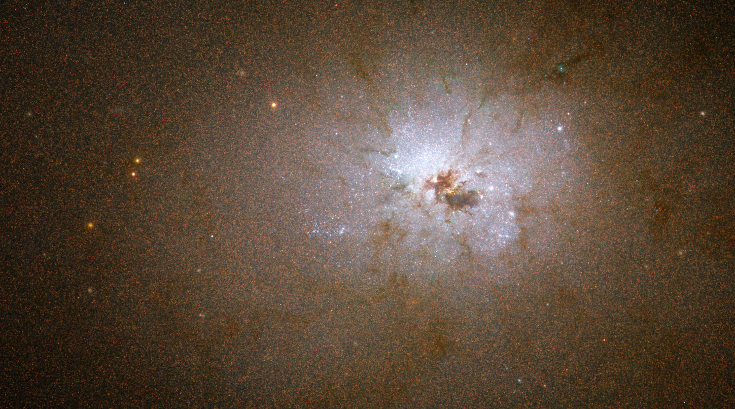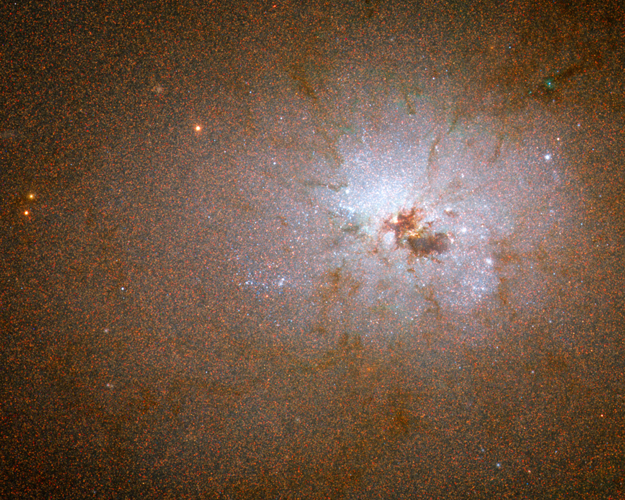 The dark clumps of material scattered around the bright nucleus of NGC 3077 are pieces of wreckage from the galaxy's interactions with its larger neighbours. NGC 3077 is a member of the M81 group of galaxies and it resides 12.5 million light-years from Earth.