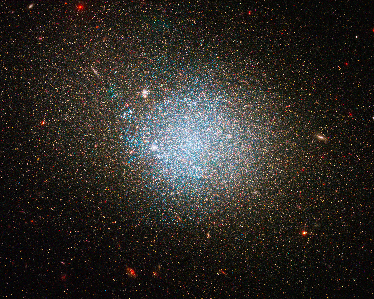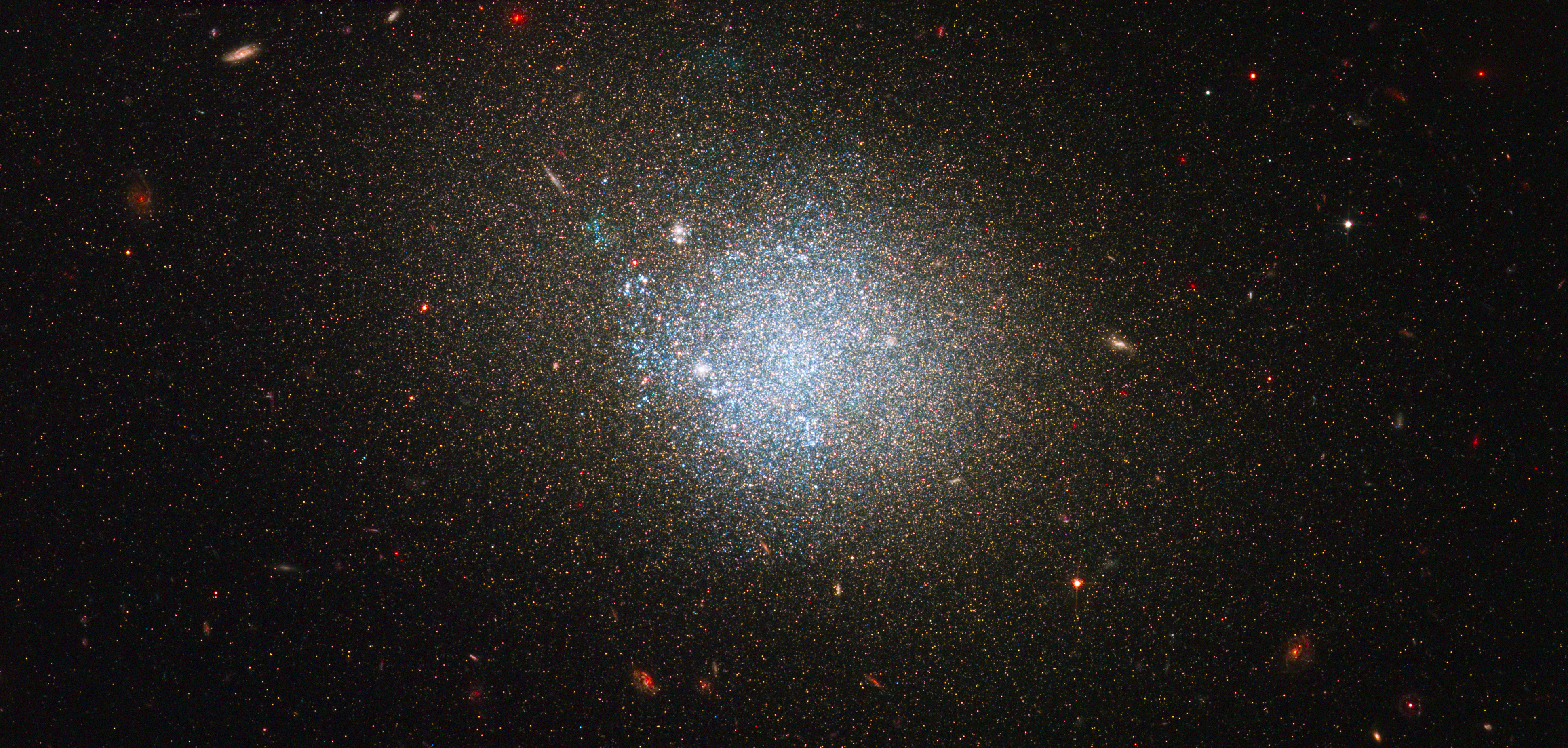 This image shows a swarm of young, blue stars in the diffuse dwarf irregular galaxy NGC 4163. It is a member of a group of dwarf galaxies near our Milky Way and is located roughly 10 million light-years away.