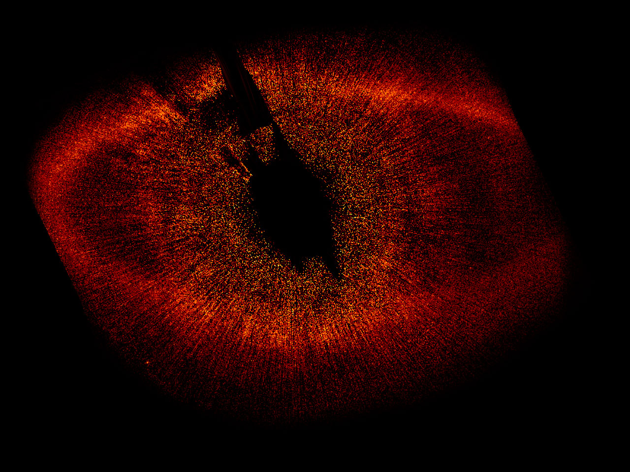 The large disk of gas surrounding Fomalhaut is clearly visible in this image taken with the High Resolution Camera (HRC) of the Advanced Camera for Surveys (ACS). The disk is not centred on Fomalhaut quite as predicted, hinting that the gravity of another body – perhaps a planet – is pulling it out of shape.