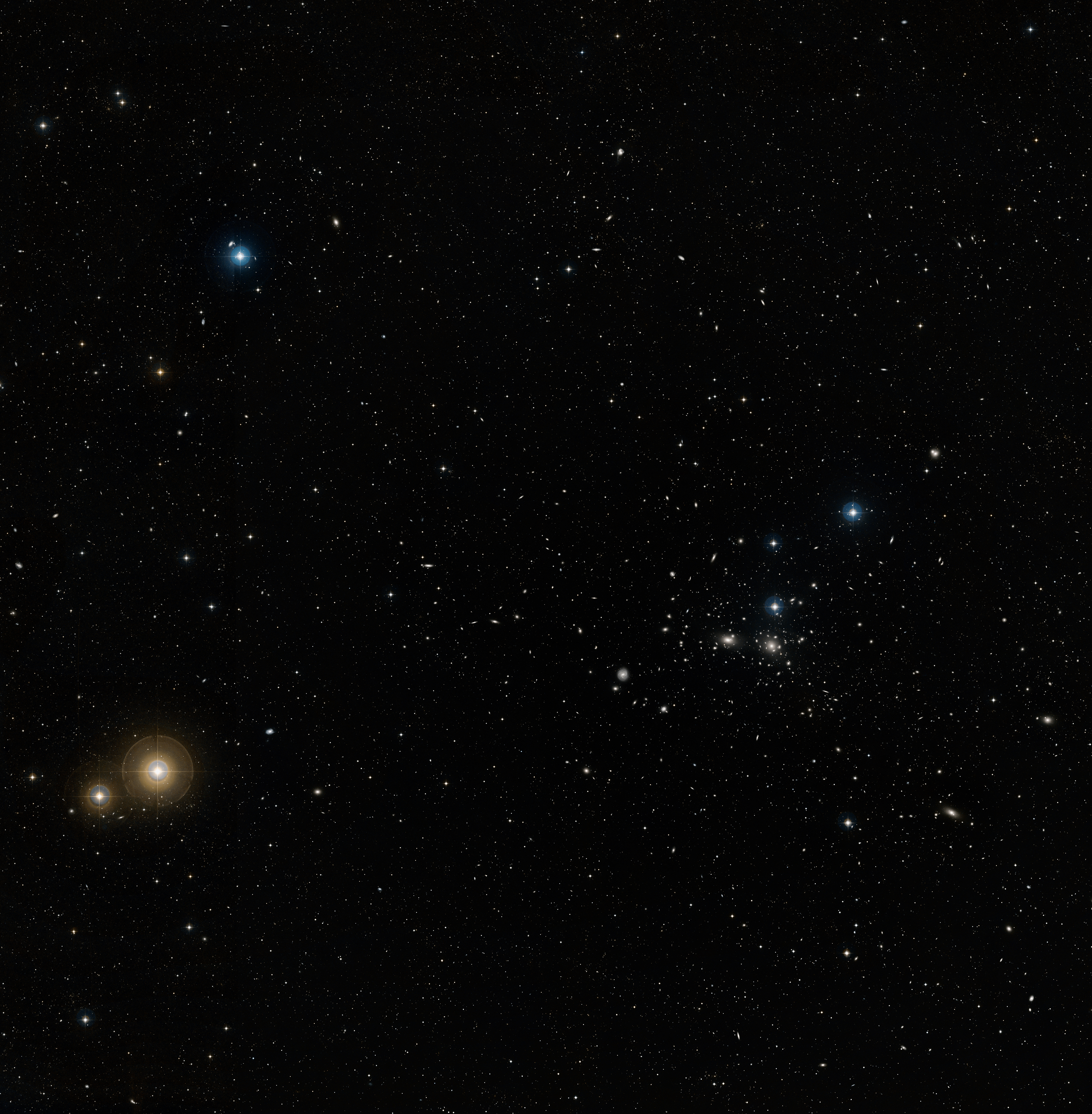 A wide-field image of the region around the Coma Galaxy Cluster (Abell 1656) constructed from the images in the Digitized Sky Survey. NGC 4921 is the small circular galaxy below and a little to the right of the centre of the image. The field-of-view is approximately 2.7° × 2.85°.