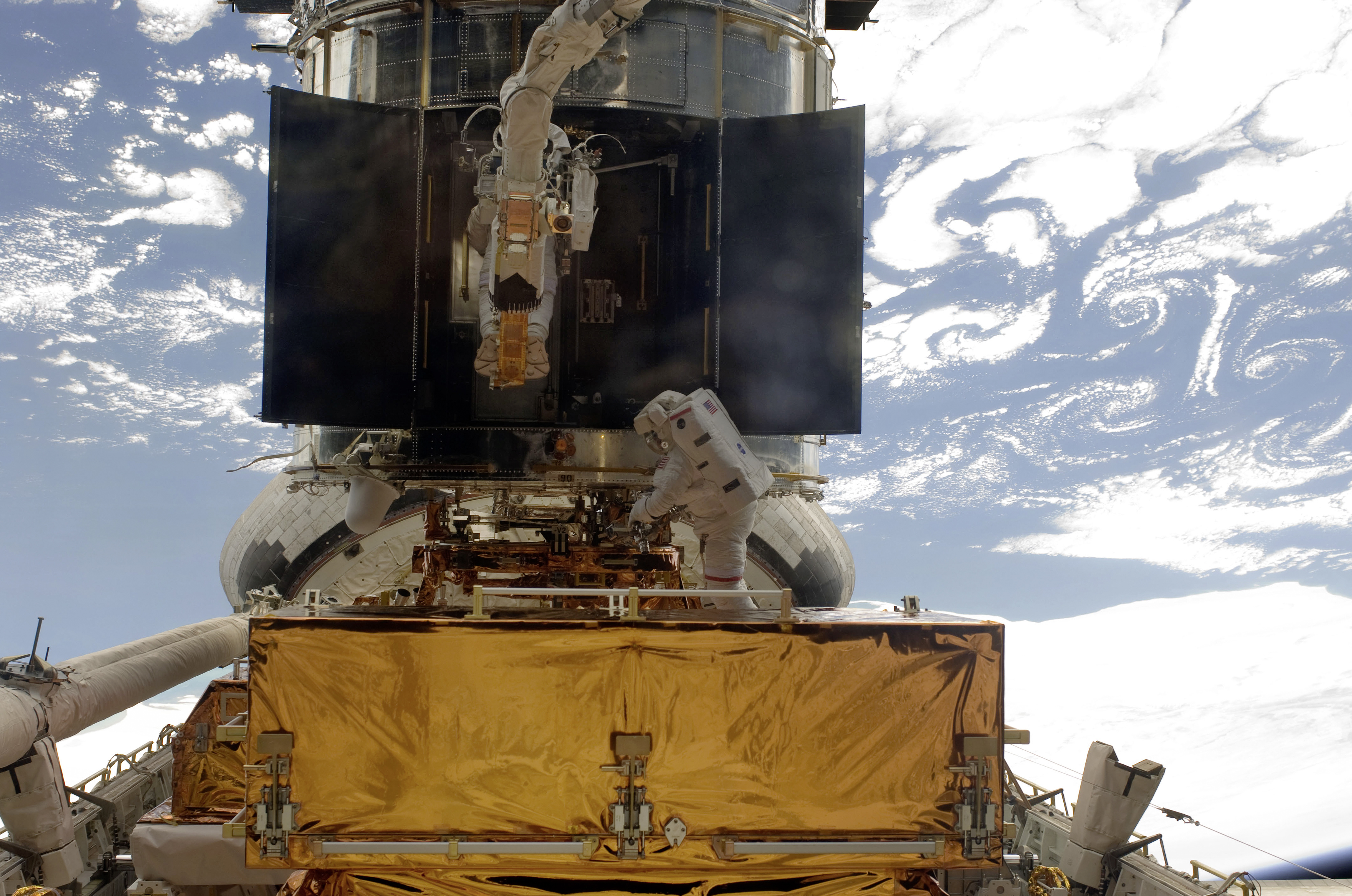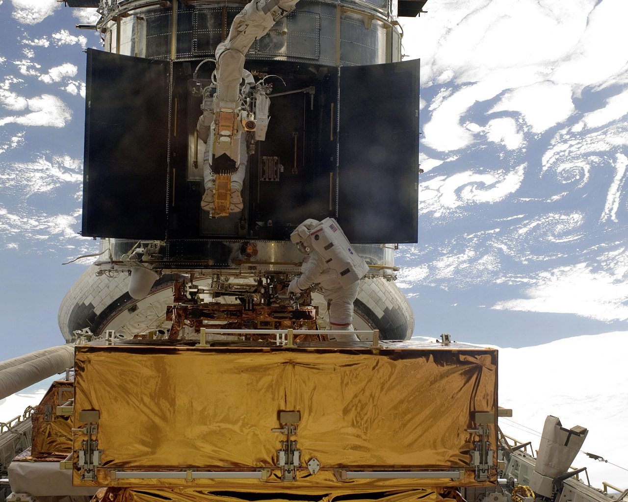 Astronauts Andrew Feustel (partially obscured at top) and John Grunsfeld work to install the new Cosmic Origins Spectrograph (COS) onboard the NASA/ESA Hubble Space Telescope on the third spacewalk of Servicing Mission 4.