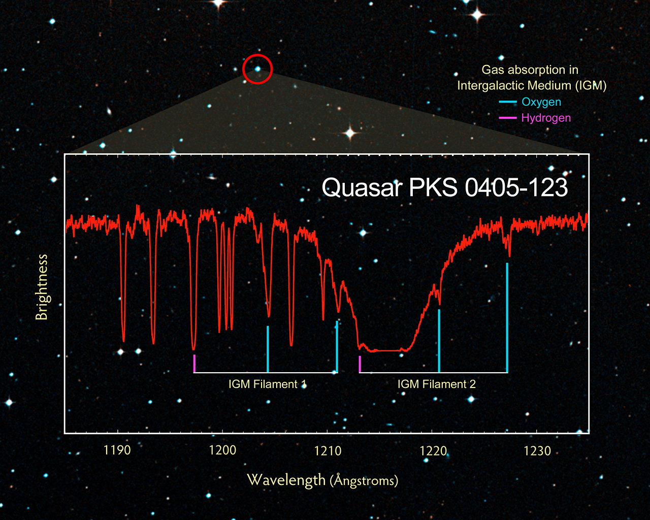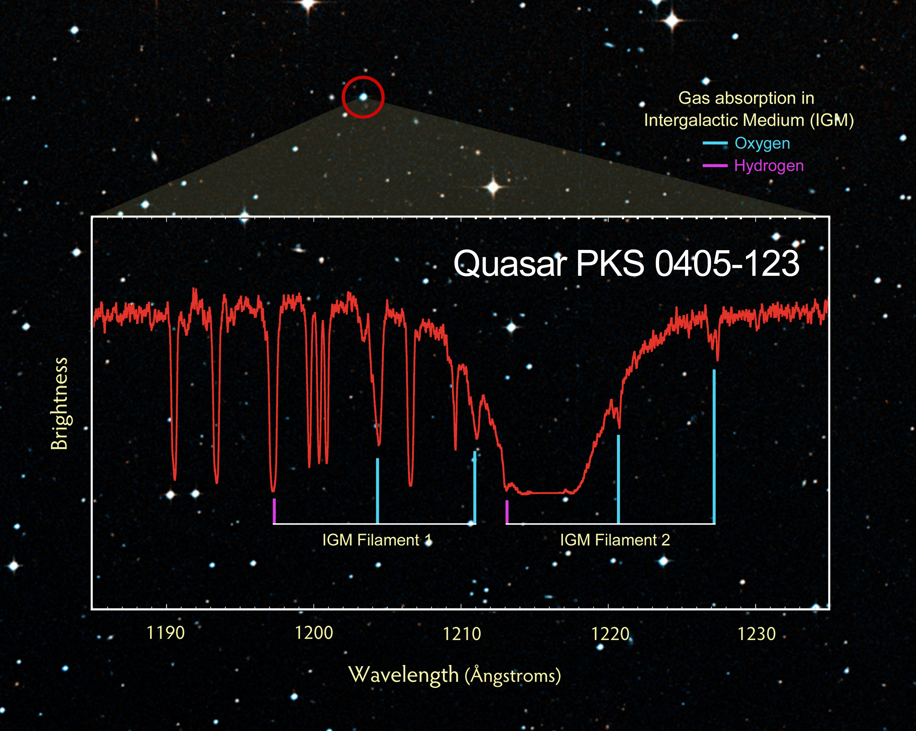 Using the light from the quasar PKS 0405-123, located 7.8 thousand million light-years away, the newly installed Cosmic Origins Spectrograph (COS) on Hubble probed a string of gas clouds residing along the light path at different distances. Quasars are the bright cores of active galaxies and are powered by supermassive black holes. Thousands of quasars have been observed, all at extreme distances from our Milky Way galaxy. The most luminous quasars radiate at a rate equivalent to a trillion Suns.