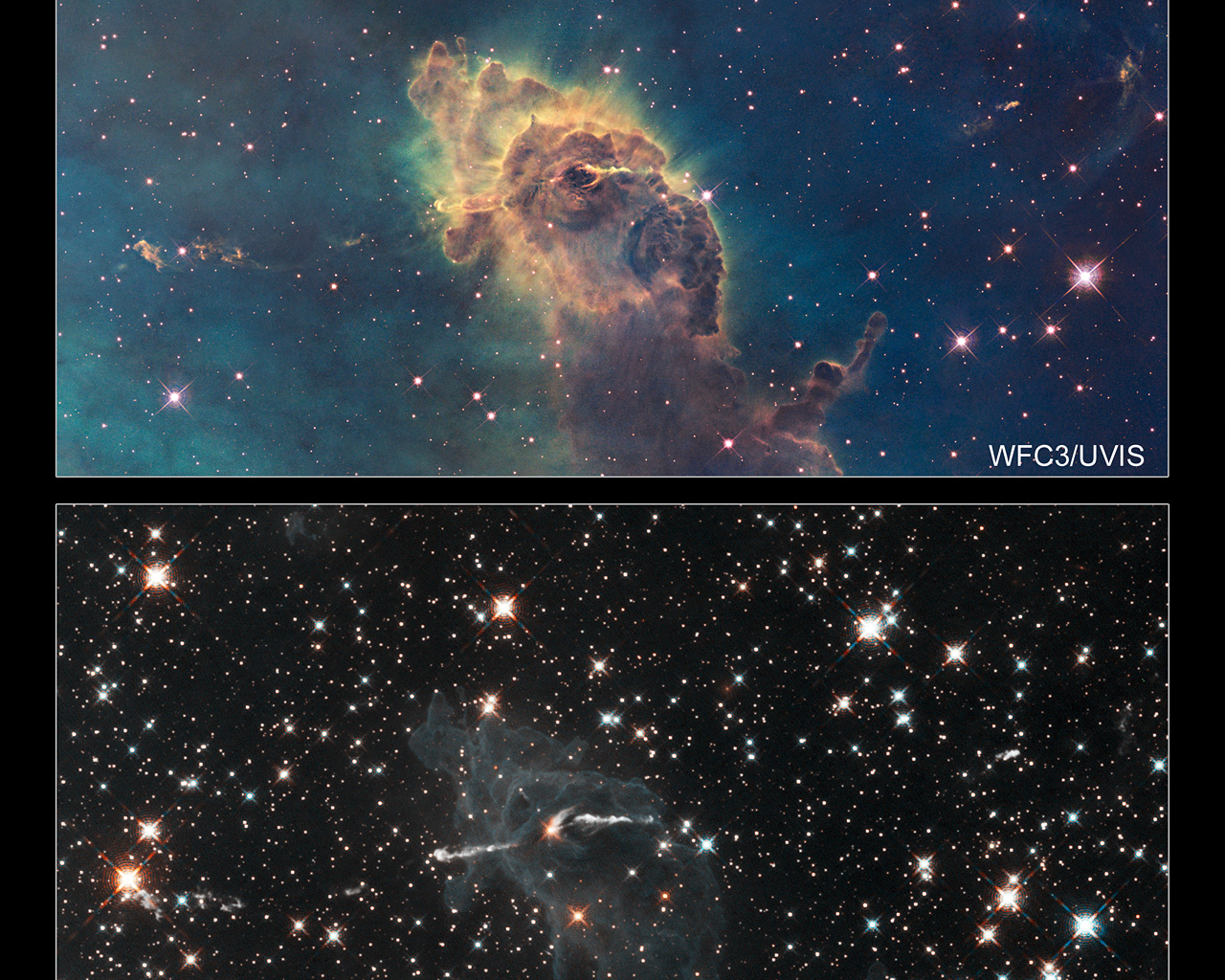 In the image at bottom, taken in near-infrared light, the dense column and the surrounding greenish-coloured gas all but disappear. Only a faint outline of the pillar remains. By penetrating the wall of gas and dust, the infrared vision of WFC3 reveals the infant star that is probably blasting the jet. Part of the jet nearest the star is more prominent in this view. These features can be seen because infrared light, unlike visible light, can pass through the dust.