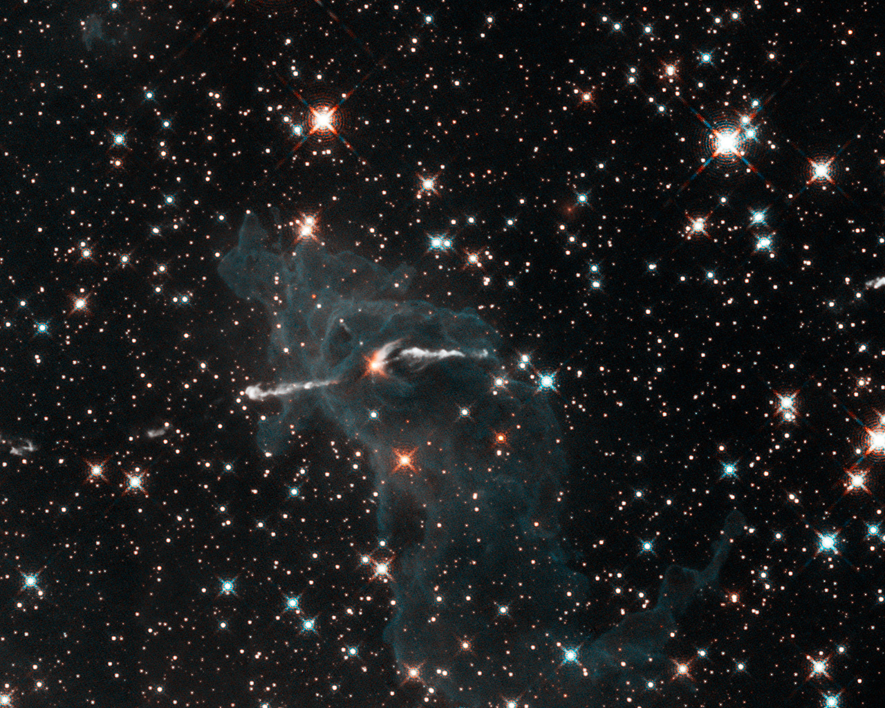 Taken in infrared light, the image shows the dense column and the surrounding greenish-coloured gas all but disappear. Only a faint outline of the pillar remains. By penetrating the wall of gas and dust, the infrared vision of WFC3 reveals the infant star that is probably blasting the jet. Part of the jet nearest the star is more prominent in this view. These features can be seen because infrared light, unlike visible light, can pass through the dust.