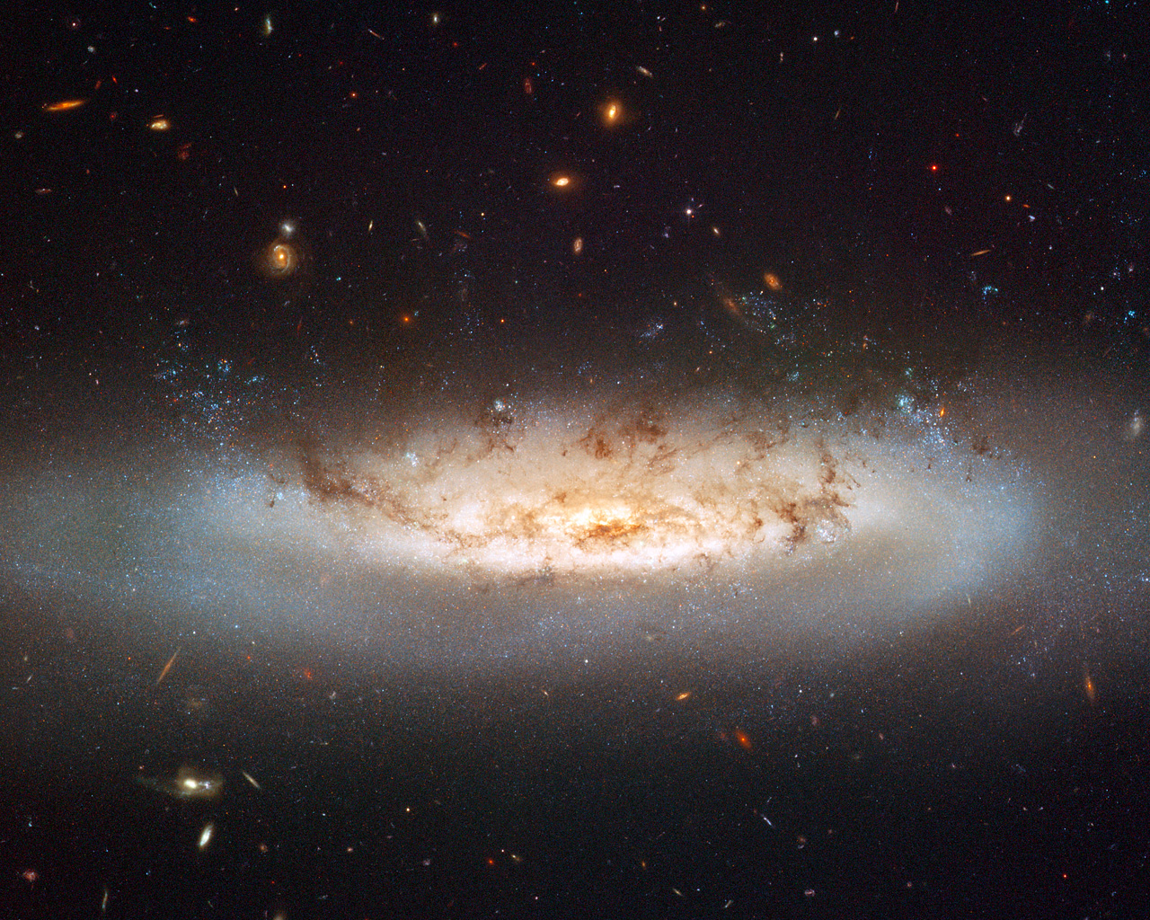 NGC 4522 is a spectacular example of a spiral galaxy that is currently being stripped of its gas content. The galaxy is part of the Virgo galaxy cluster and its rapid motion within the cluster results in strong winds across the galaxy as the gas within is left behind. Scientists estimate that the galaxy is moving at more than 10 million kilometres per hour. A number of newly formed star clusters that developed in the stripped gas can be seen in the Hubble image. The stripped spiral galaxy is located some 60 million light-years away from Earth.