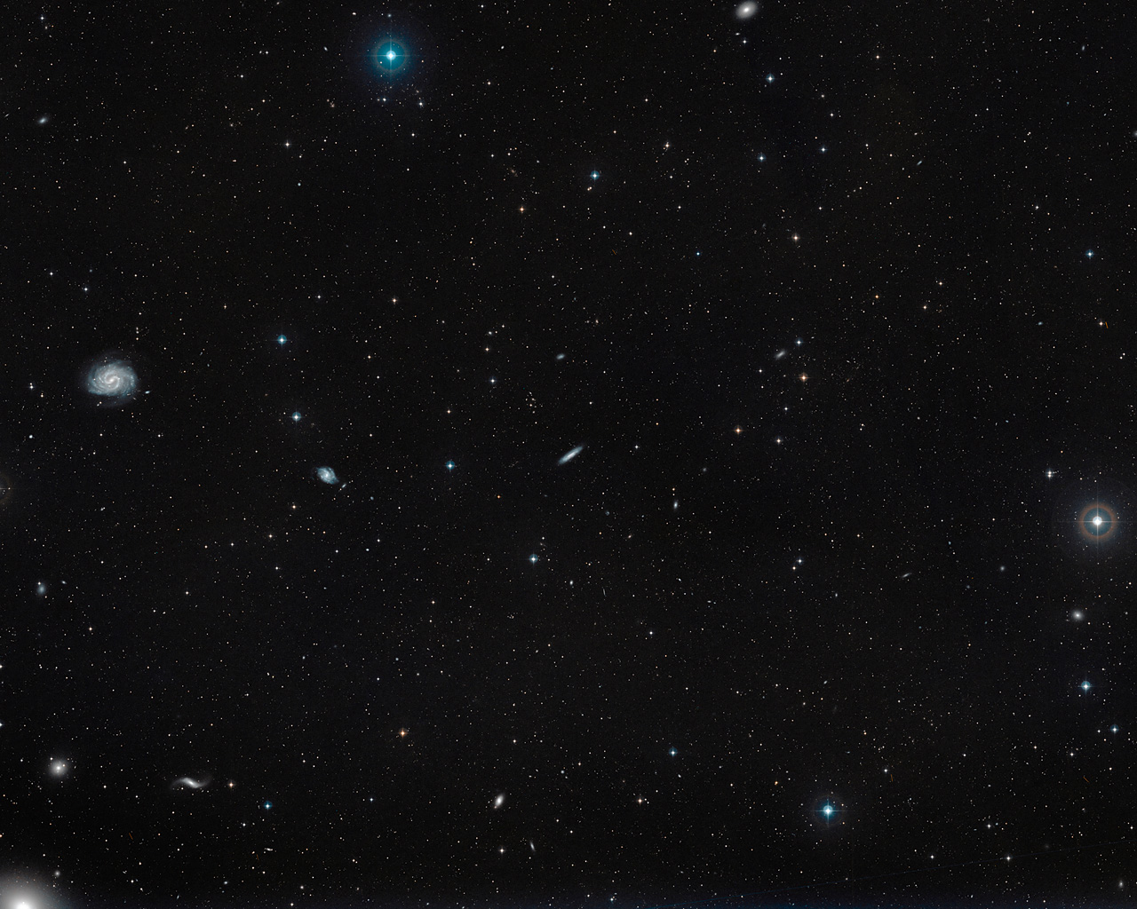 A wide-field image of the region around NGC 4522 constructed from images in the Digitized Sky Survey. The field-of-view is approximately 2.4 degrees × 1.9 degrees.