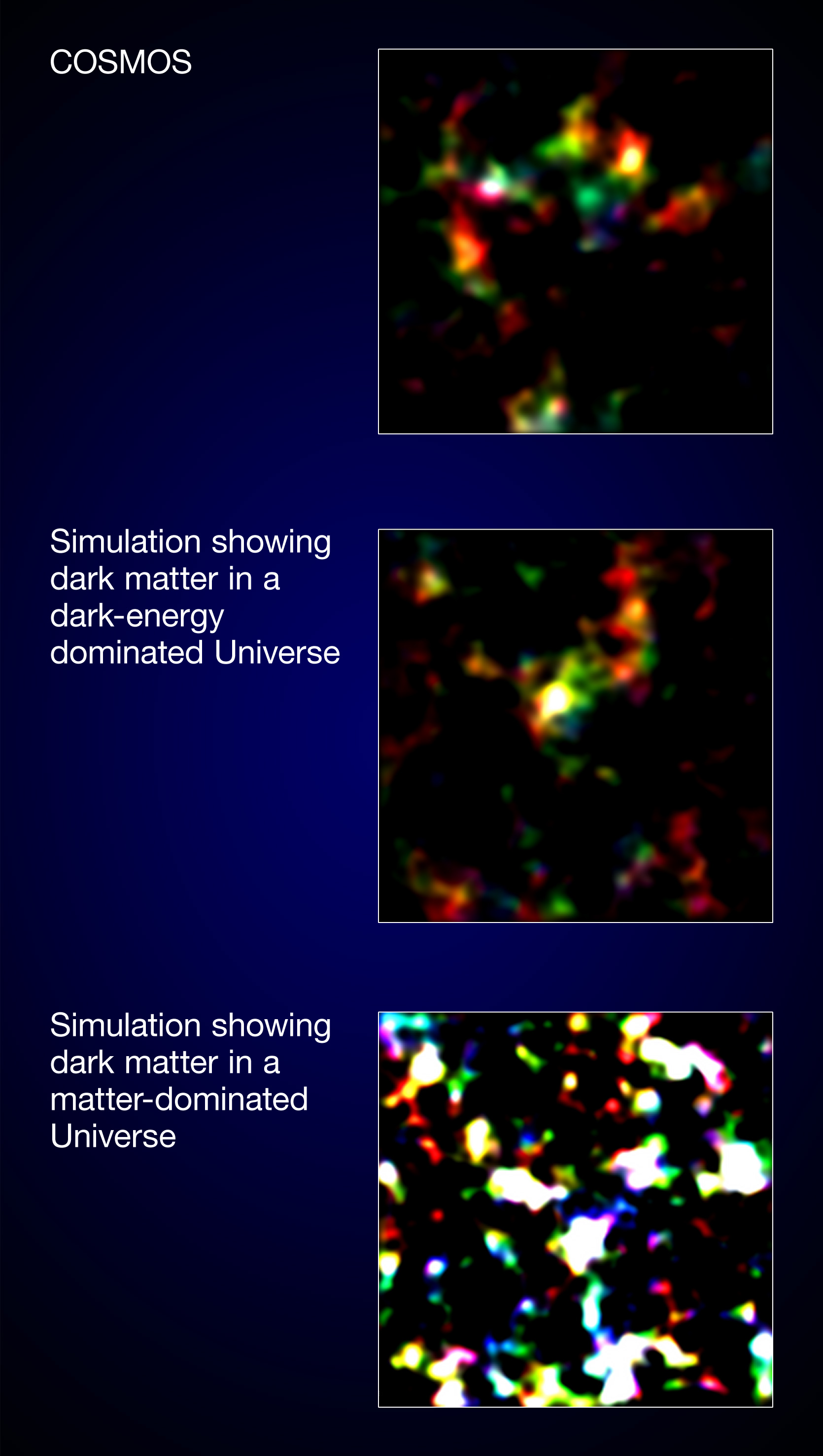 Astronomers who conducted one of the most thorough studies of the COSMOS survey - the largest survey ever undertaken by the NASA/ESA Hubble Space Telescope - compared the actual mass map obtained from COSMOS to two simulated model maps. The statistical properties of dark energy-dominated model (the number of mass peaks and how they cluster), is the best match for the actual COSMOS field.