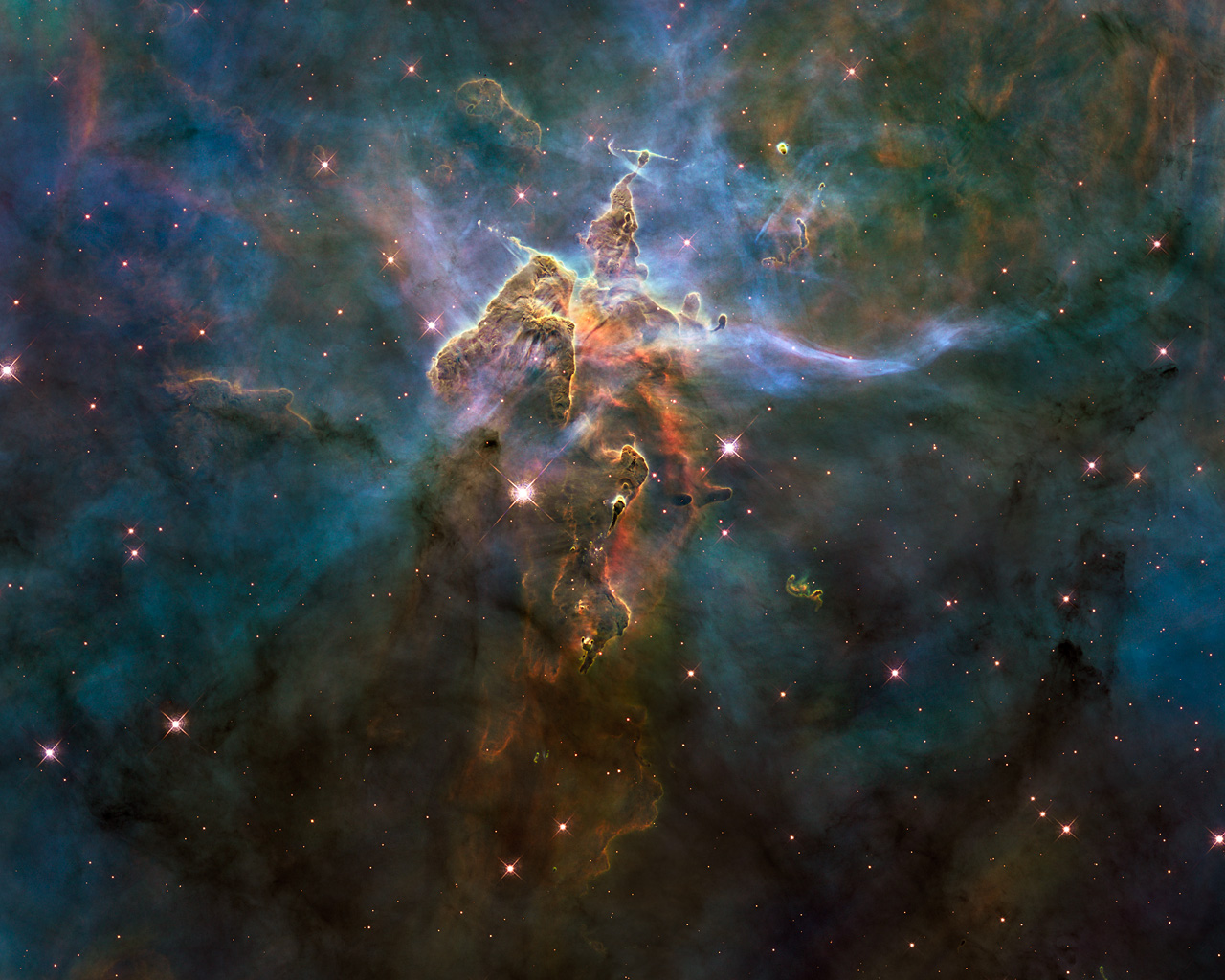 This turbulent cosmic pinnacle lies within a tempestuous stellar nursery called the Carina Nebula, located 7500 light-years away in the southern constellation of Carina. The image marks the 20th anniversary of Hubble's launch and deployment into Earth orbit.