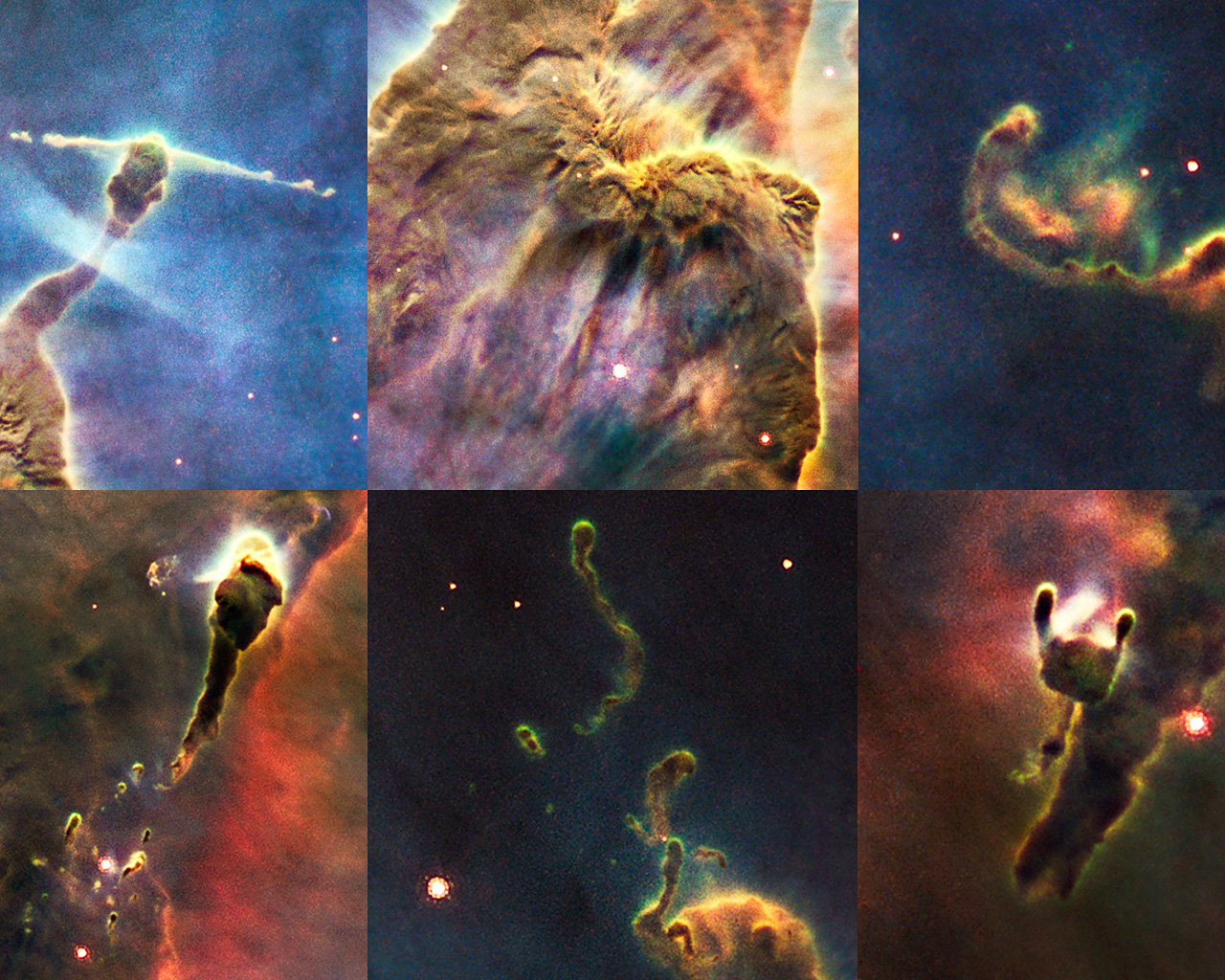This is a series of close-up views of the complex gas structures in a small portion of the Carina Nebula. The nebula is a cold cloud of predominantly hydrogen gas. It is laced with dust, which makes the cloud opaque. The cloud is being eroded by a gusher of ultraviolet light from young stars in the region. They sculpt a variety of fantasy shapes, many forming tadpole-like structures. In some frames, smaller pieces of nebulosity can be seen freely drifting, such as the structure, four trillion kilometres long, at upper right. The most striking feature is a horizontal jet 5.5 trillion kilometres long in the upper left frame. It is being blasted into space by a young star hidden in the tip of the pillar-like structure. A bowshock has formed near the tip of the jet.