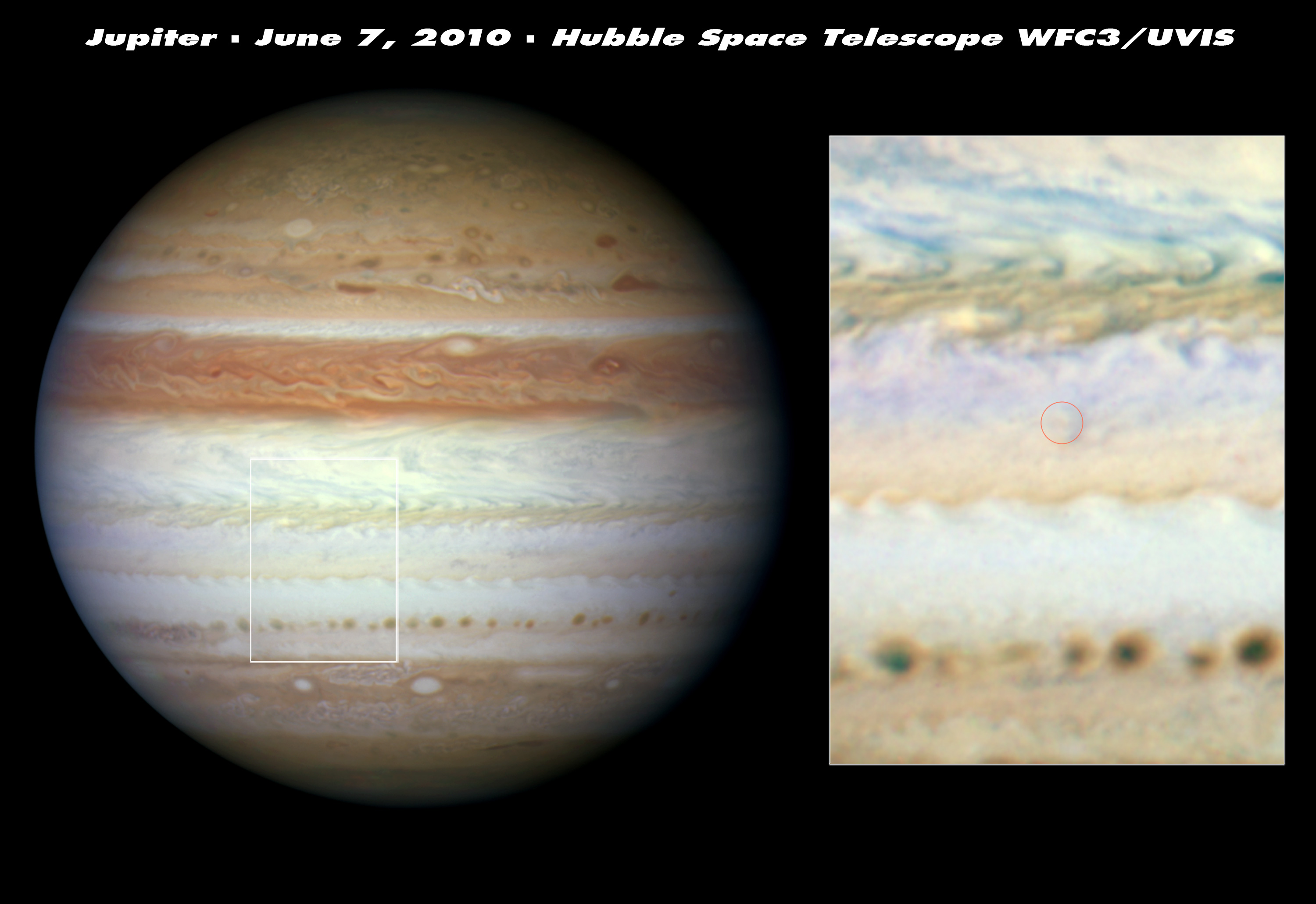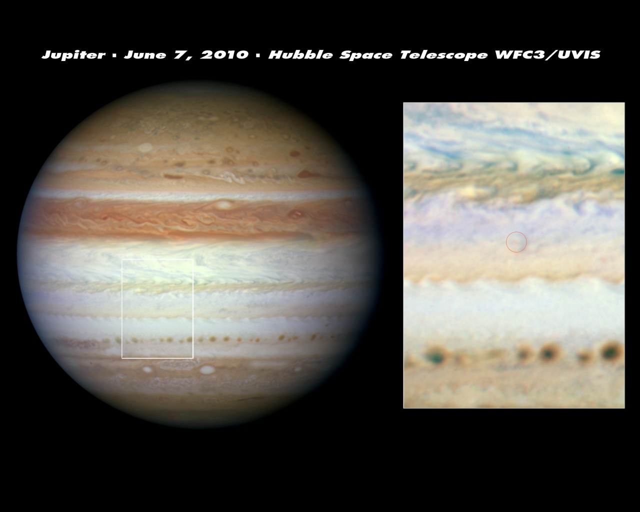 Hubble's sharp vision and ultraviolet sensitivity were used to seek out any trace evidence of the aftermath of the cosmic collision (right inset). Images taken on 7 June show no sign of dark debris above Jupiter's cloud tops. This means that the object didn't descend beneath the clouds and explode as a fireball. If it had, dark sooty blast debris would have been ejected and would have subsequently settled down onto the cloud tops.