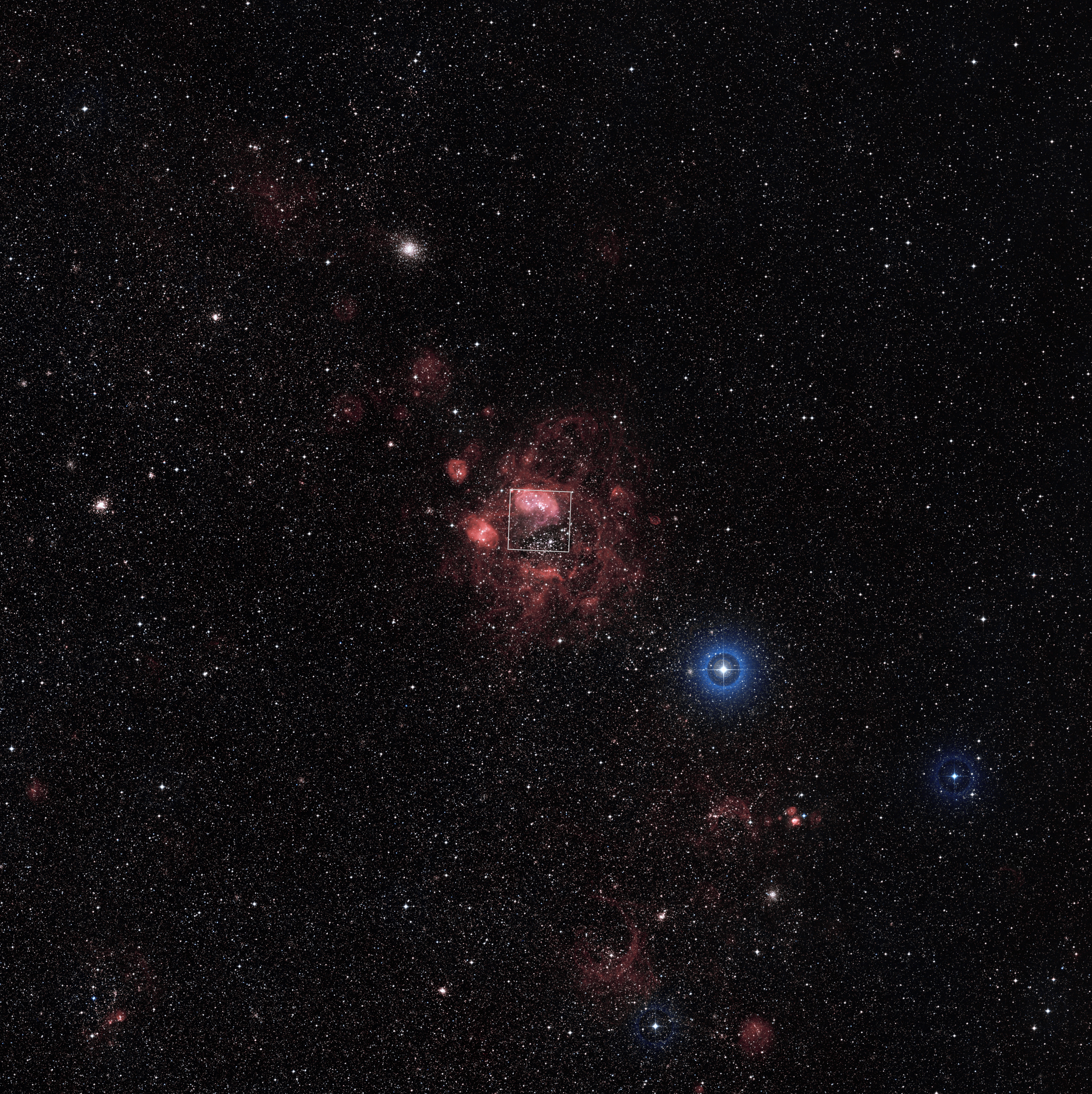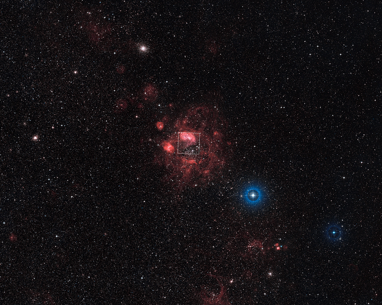 Location of the new Hubble image of the star forming region LHA 120-N 11. This image was created from digitised photographs through red and blue filters. The field of view is about three degrees across.