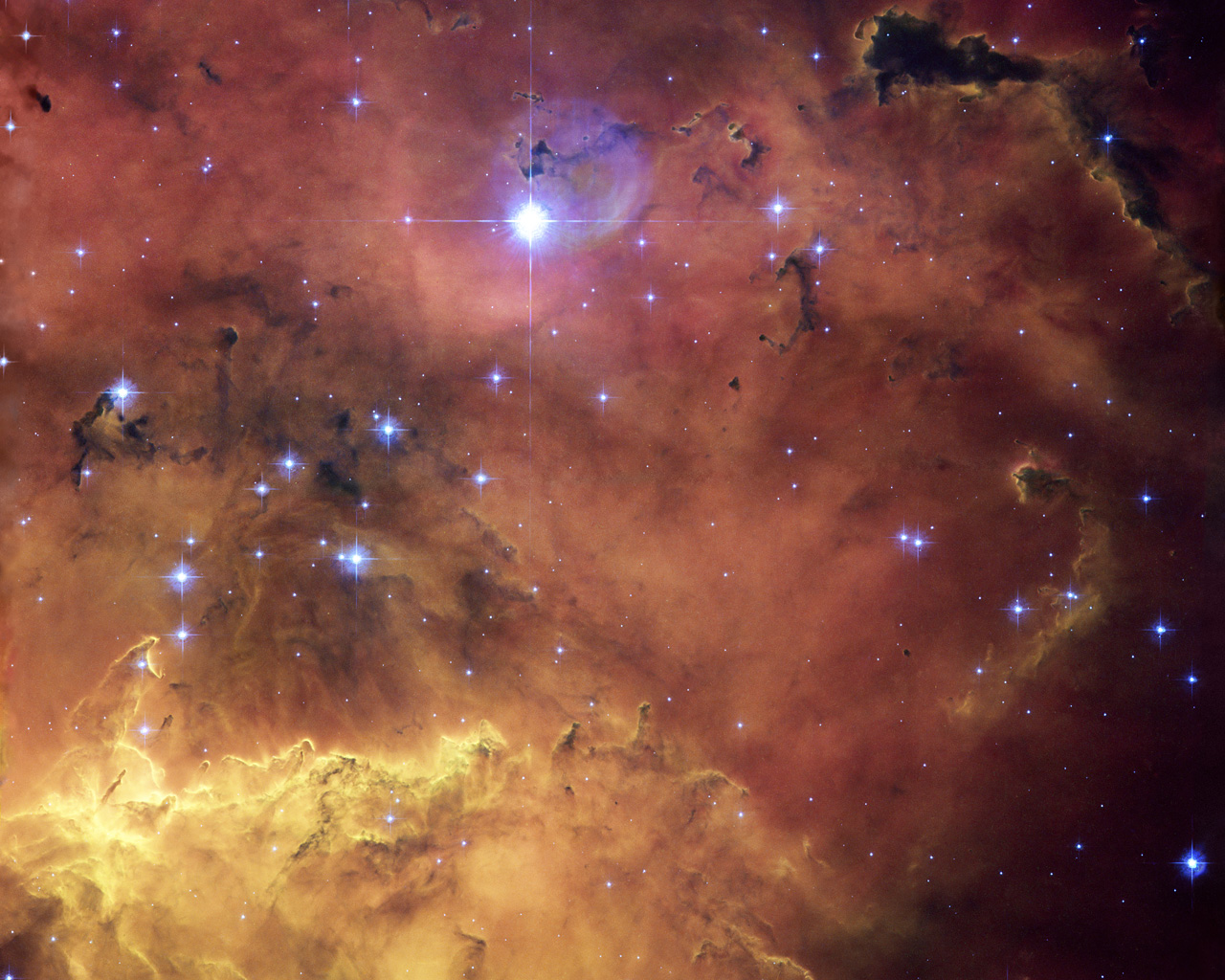 Strangely shaped dust clouds, resembling spilled liquids, are silhouetted against a colourful background of glowing gas. Like the familiar Orion Nebula, NGC 2467 is a huge cloud of gas - mostly hydrogen - that serves as an incubator for new stars.