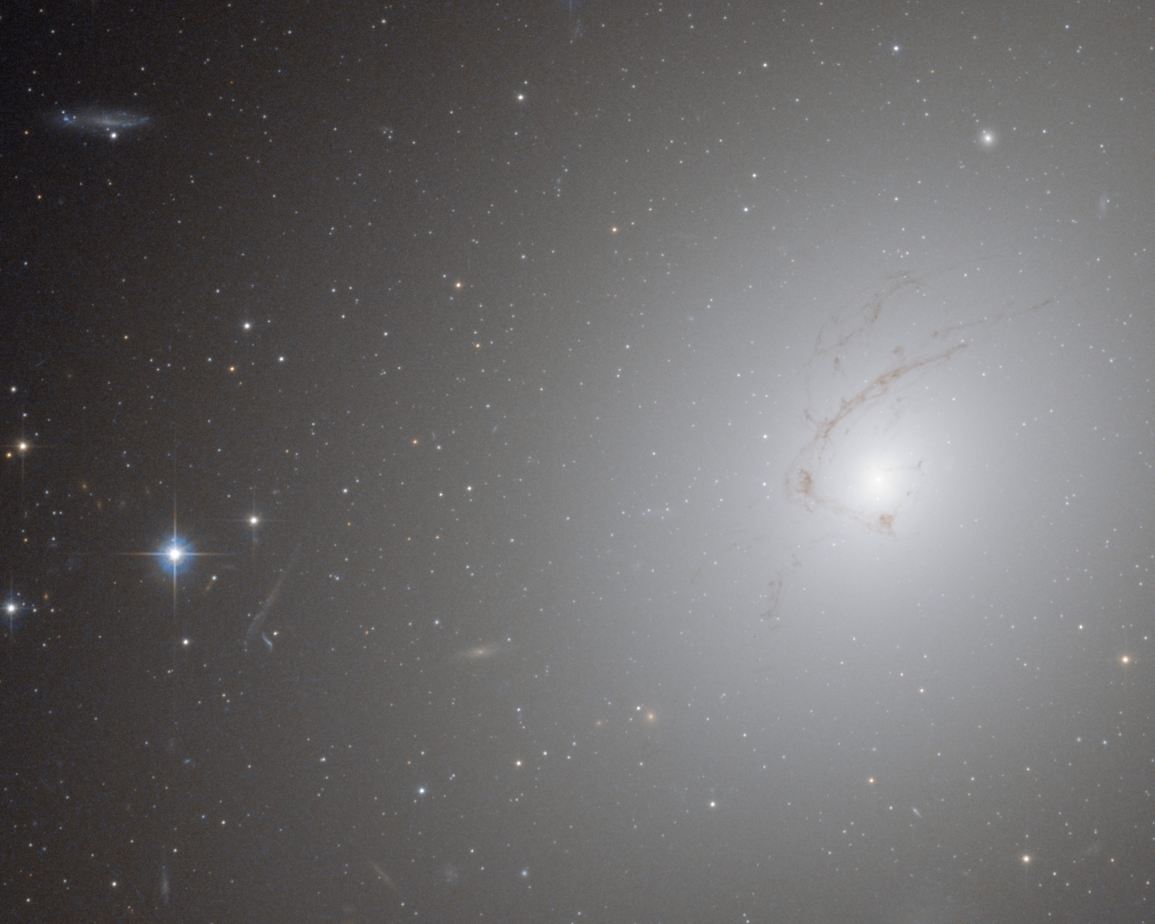 The huge dust lane, around 30 000 light-years across, that sweeps across the face of the galaxy makes NGC 4696 look different from most other elliptical galaxies. Viewed at certain wavelengths, strange thin filaments of ionised hydrogen are visible within it. In this picture, these structures are visible as a subtle marbling effect across the galaxy’s bright centre.