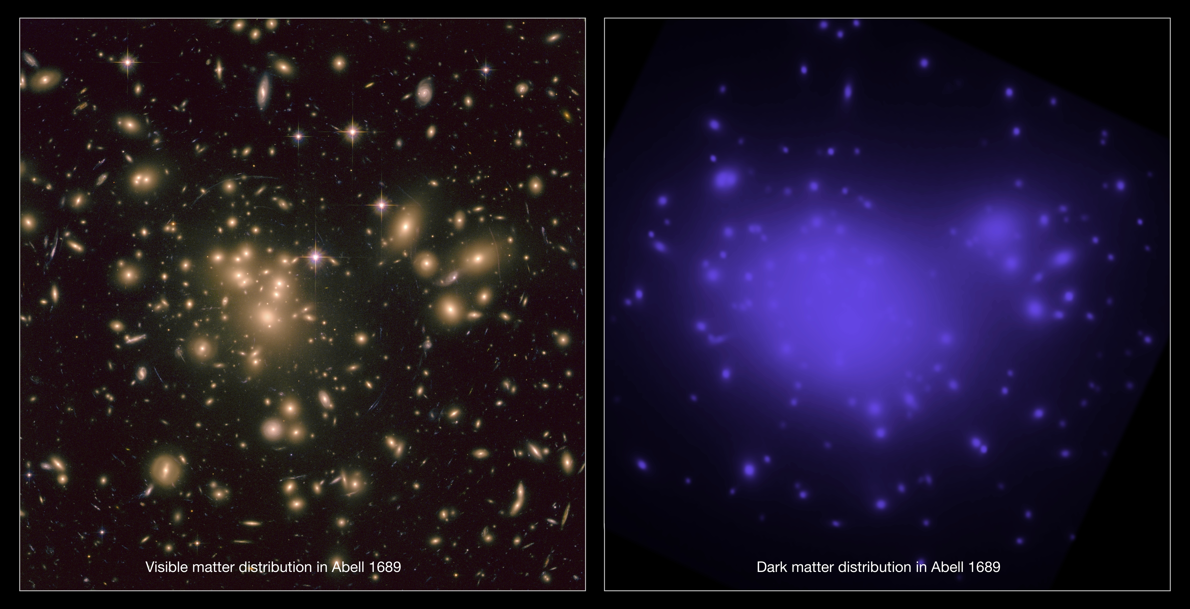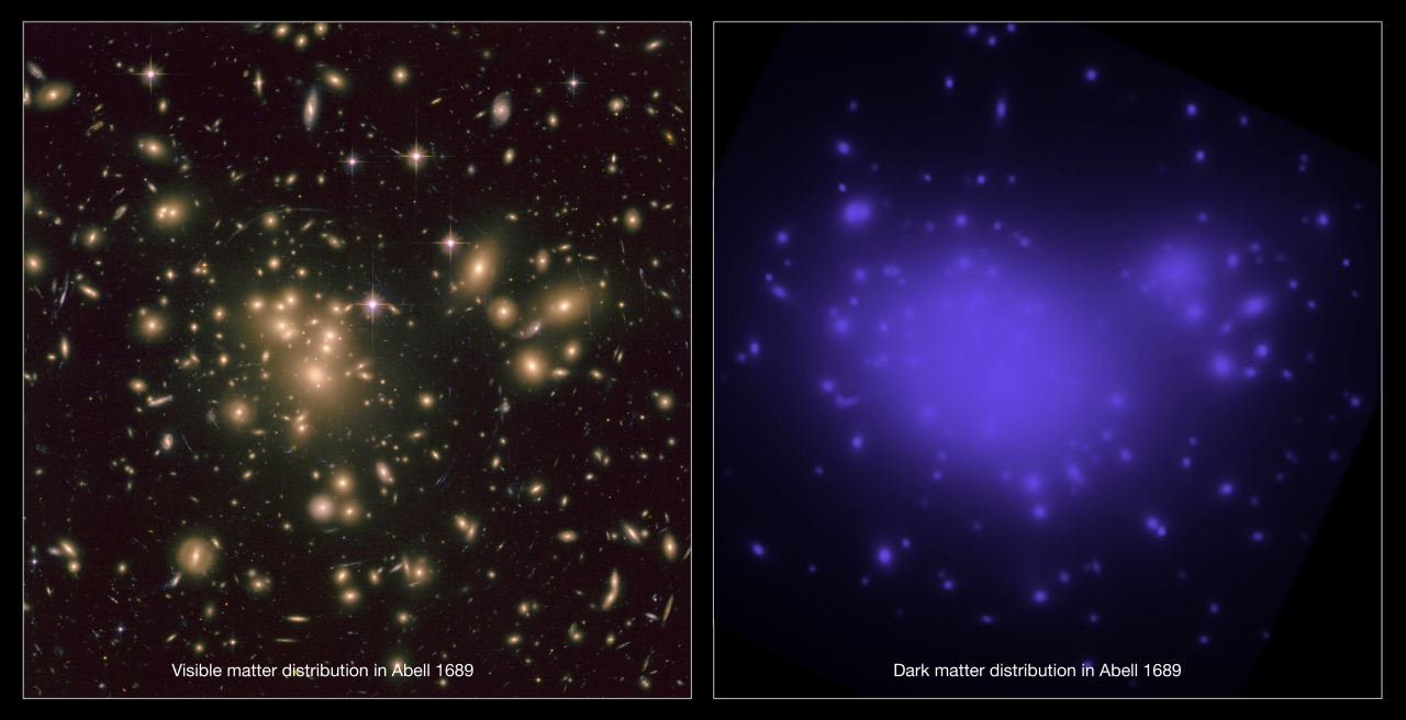 This image shows (to the left) the visible matter in galaxy cluster Abell 1689 along with the distorted background galaxies clearly visible.