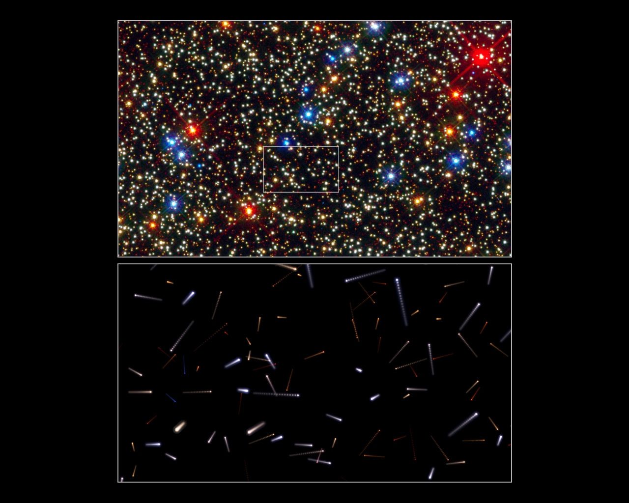 The multi-colour snapshot (top), taken with the Wide Field Camera 3 aboard the NASA/ESA Hubble Space Telescope, captures the central region of the giant globular cluster Omega Centauri. All the stars in the image are moving in random directions, like a swarm of bees. Astronomers used Hubble's exquisite resolving power to measure positions for stars in 2002 and 2006.