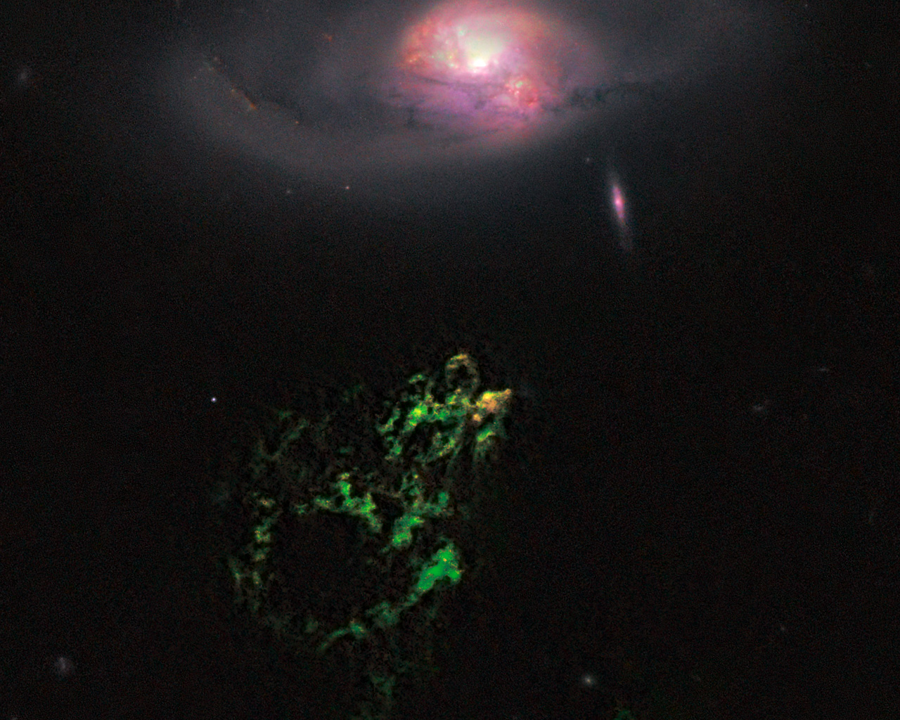The bizarre object, dubbed Hanny's Voorwerp (Hanny's Object in Dutch), is the only visible part of a streamer of gas stretching 300 000 light-years around the galaxy, called IC 2497. The greenish Voorwerp is visible because a searchlight beam of light from the galaxy's core has illuminated it. This beam came from a quasar, a bright, energetic object that is powered by a black hole. The quasar may have turned off in the last 200 000 years.