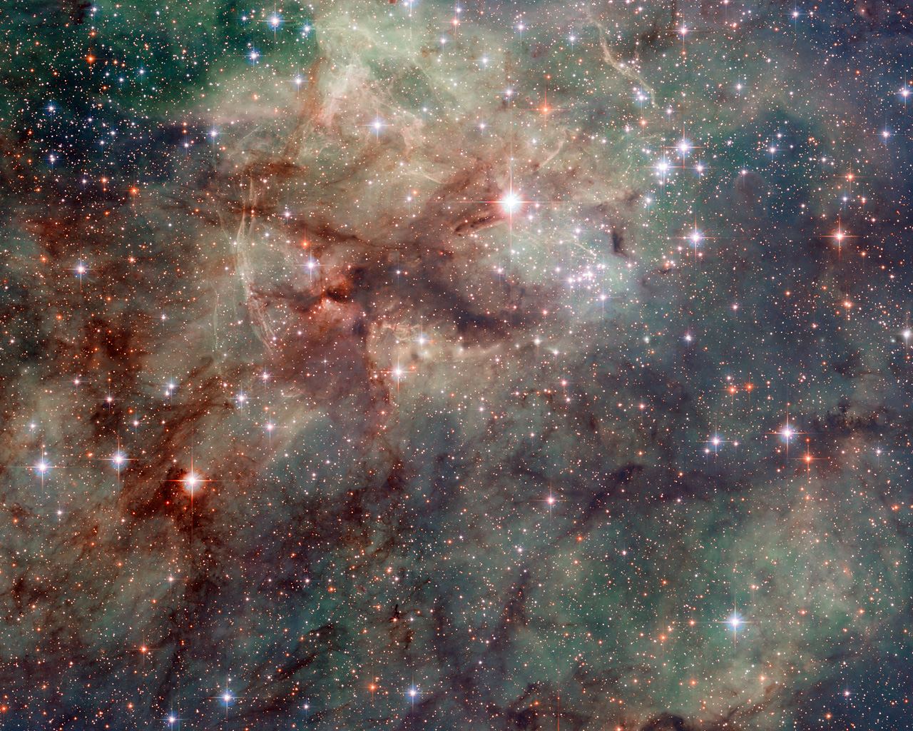 Hubble has taken this stunning close-up shot of part of the Tarantula Nebula. This star-forming region of ionised hydrogen gas is in the Large Magellanic Cloud, a small galaxy which neighbours the Milky Way. It is home to many extreme conditions including supernova remnants and the heaviest star ever found. The Tarantula Nebula is the most luminous nebula of its type in the local Universe.