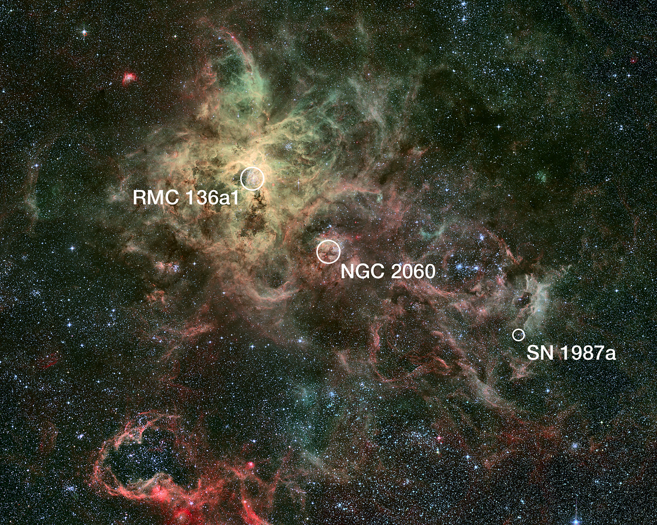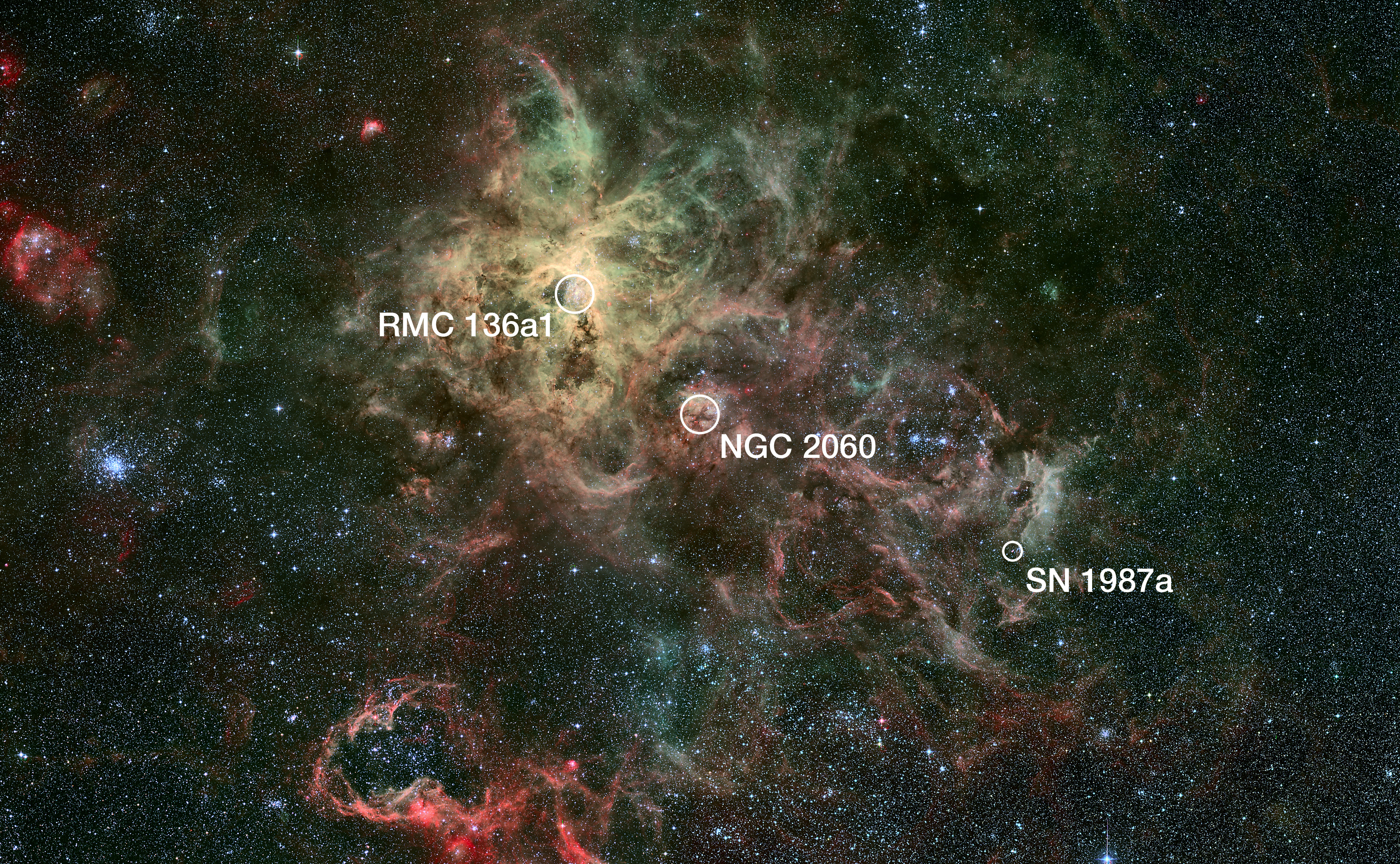 This wide-field view of the Tarantula Nebula was taken with the Wide Field Imager (WFI) on the MPG/ESO 2.2-metre telescope at the European Southern Observatory's site at La Silla, Chile. This view shows the location of the heaviest star ever discovered (RMC 136a1, within the super star cluster RMC 136), the closest supernova to Earth to have been observed since the invention of the telescope (SN 1987a), plus the remnants of another supernova (NGC 2060). The Tarantula Nebula is the brightest nebula of its type in the local Universe.
