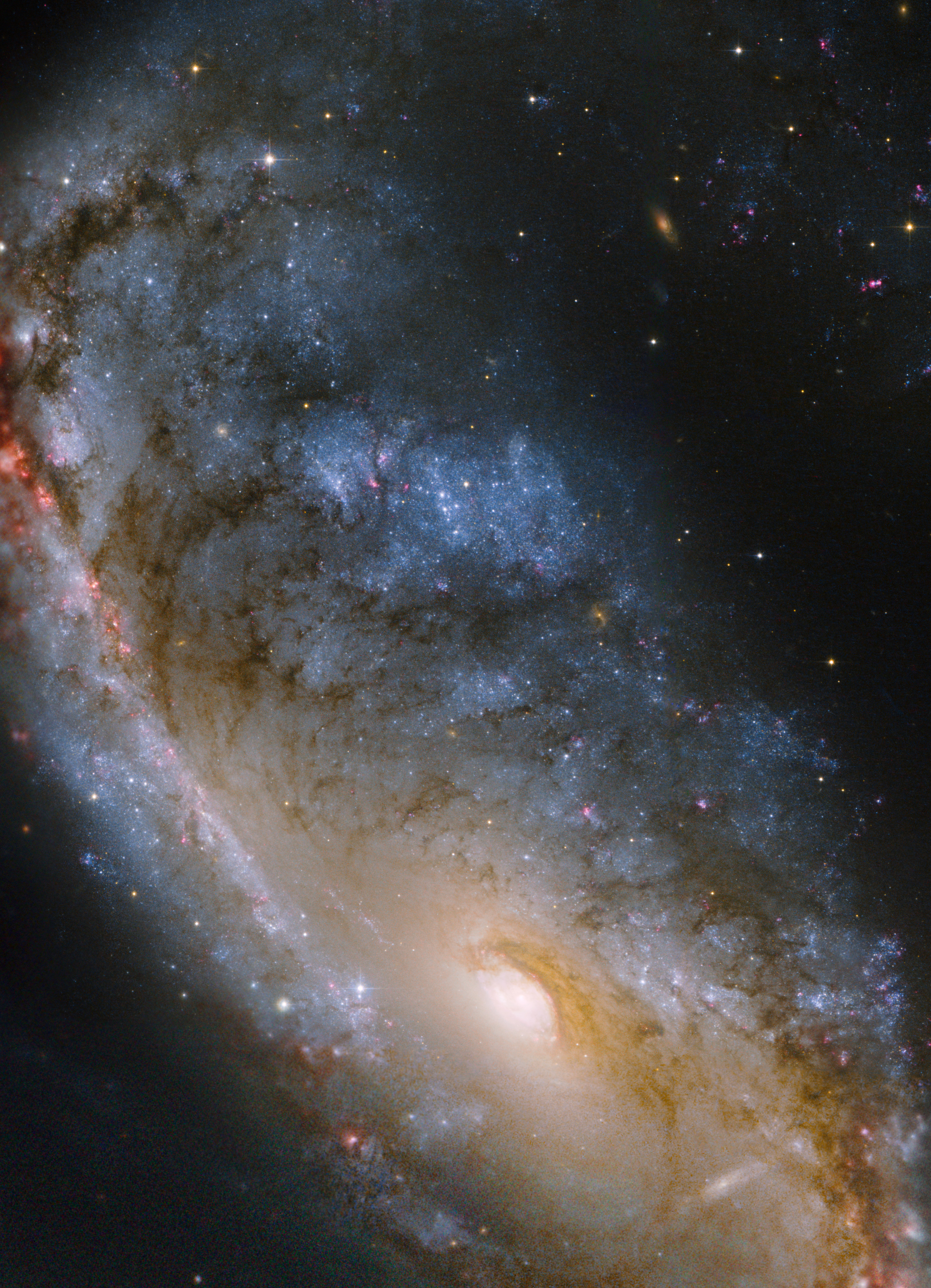 This close-up Hubble view of the Meathook Galaxy (NGC 2442) focuses on the more compact of its two asymmetric spiral arms as well as the central regions. The spiral arm was the location of a supernova that exploded in 1999. These Hubble observations were made in 2006 in order to study the aftermath of this supernova. Ground-based data from MPG/ESO 2.2-metre telescope were used to fill out parts of the edges of this image.