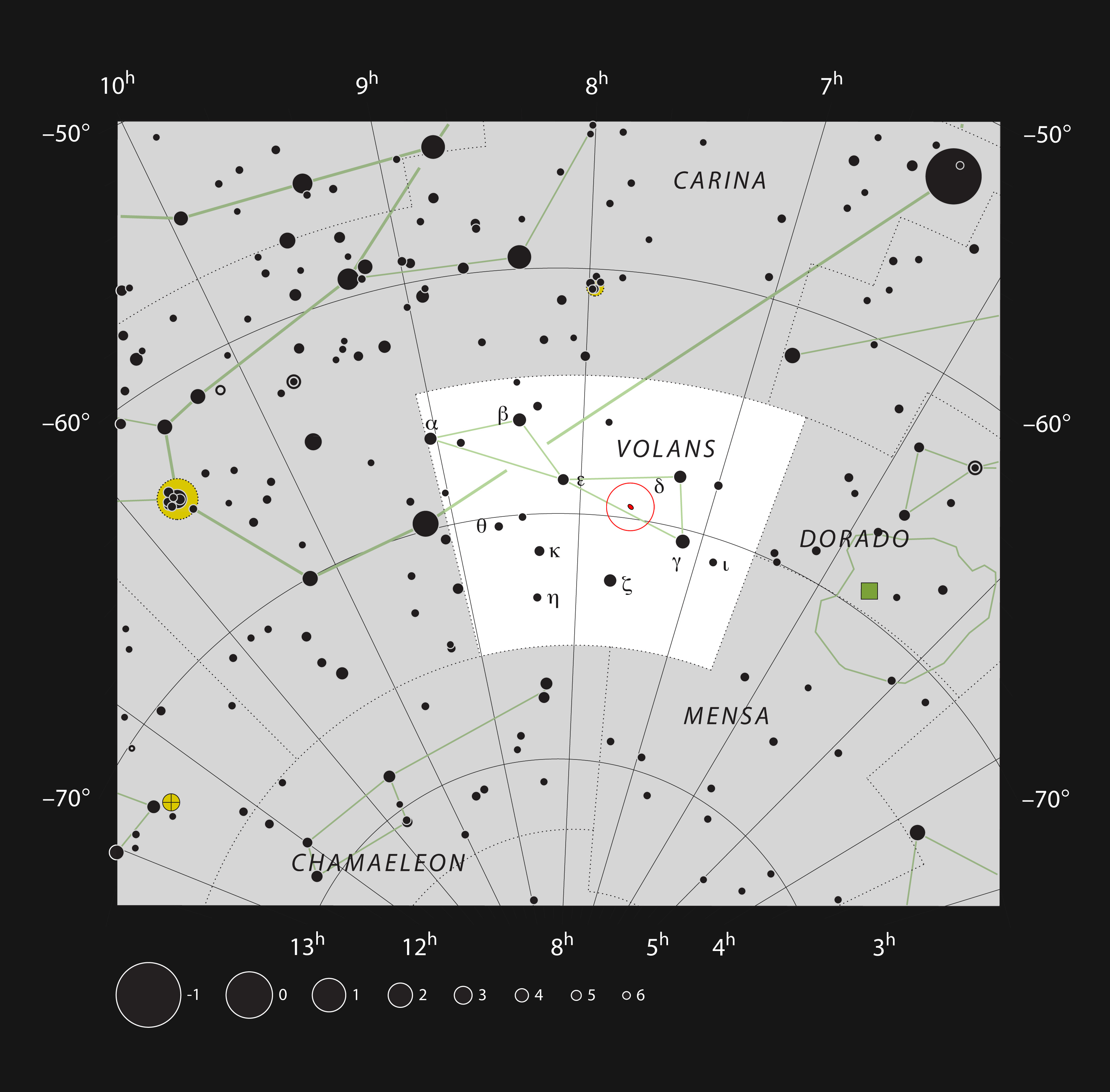 This chart shows the location of the peculiar spiral galaxy NGC 2442 within the constellation of Volans (The Flying Fish). This map shows most of the stars visible to the unaided eye under good conditions and the galaxy itself is marked as a small red ellipse surrounded by a red circle. This galaxy can be easily seen with a moderate-sized telescope.