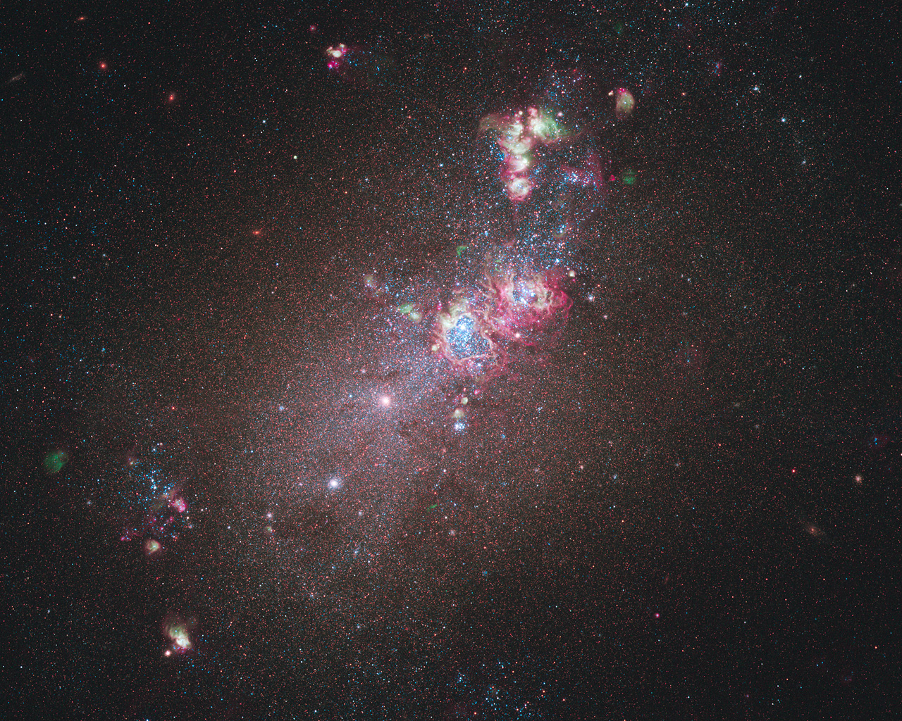 Galaxy NGC 4214, pictured here in an image from the NASA/ESA Hubble Space Telescope's newest camera, is an ideal location to study star formation and evolution. Dominating much of the galaxy is a huge glowing cloud of hydrogen gas in which new stars are being born. A heart-shaped hollow - possibly galaxy NGC 4214's most eye-catching feature - can be seen at the centre of this. Inside this cavity lies a large cluster of massive, young stars ranging in temperature from 10&nbps;000 to 50&nbps;000 degrees Celsius. Their strong stellar winds are responsible for the creation of this bubble. These features have the effect of stemming any further star formation due to the subsequent lack of gas.
