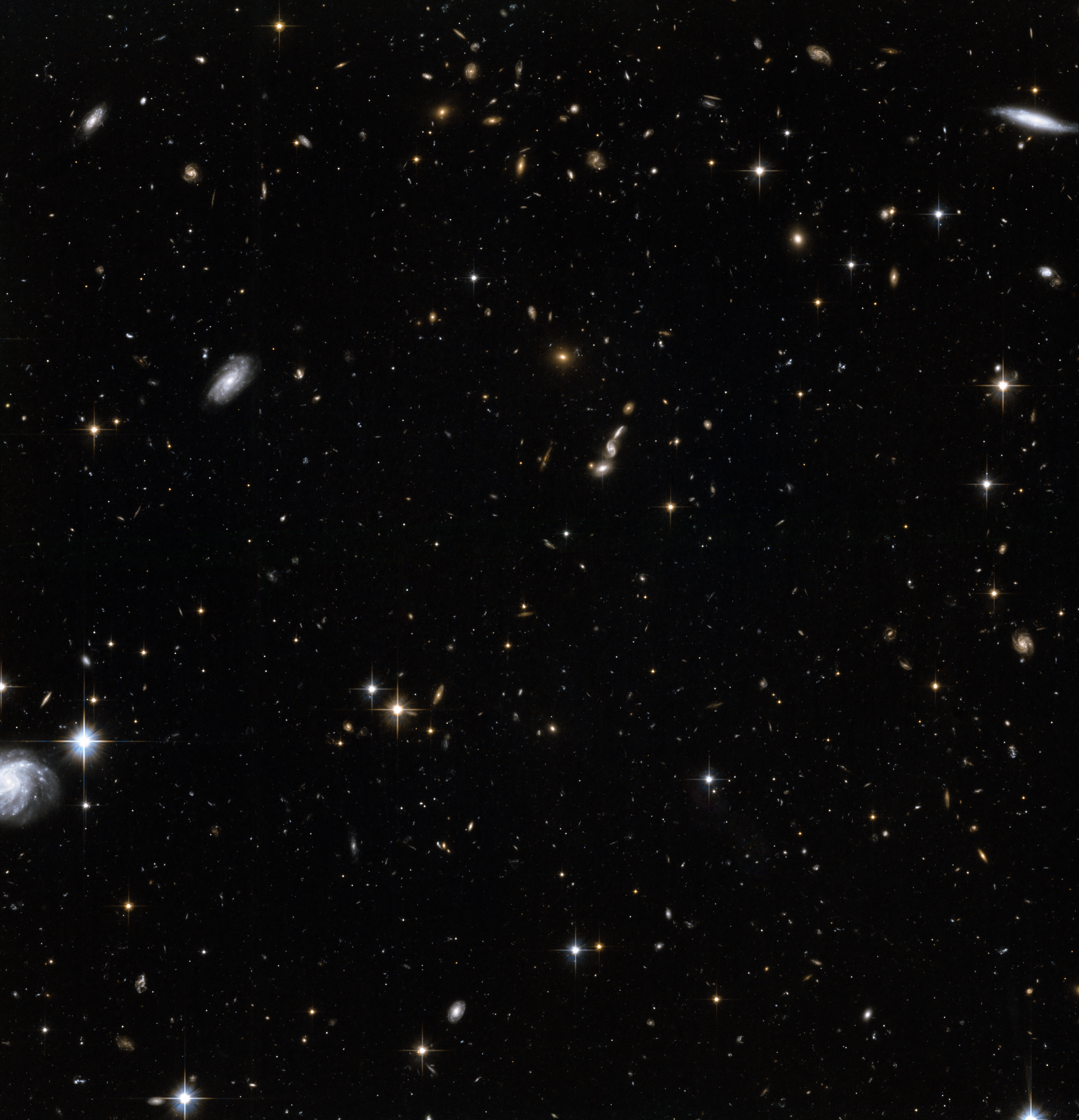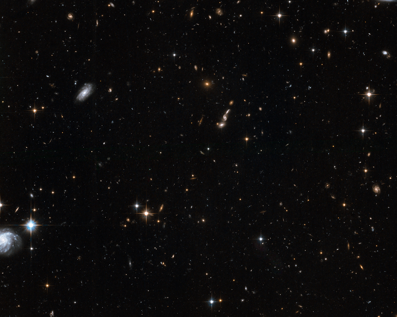 Hubble's position above the distorting effect of the atmosphere, combined with the galaxy's relative proximity, means that this image can be resolved into individual stars, rather than the cloudy white wisps usually seen in observations of galaxies. In the background, many faraway galaxies are visible, billions of light-years further away than the Andromeda Galaxy.