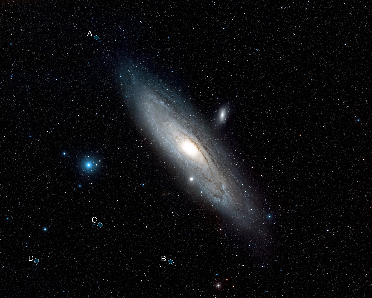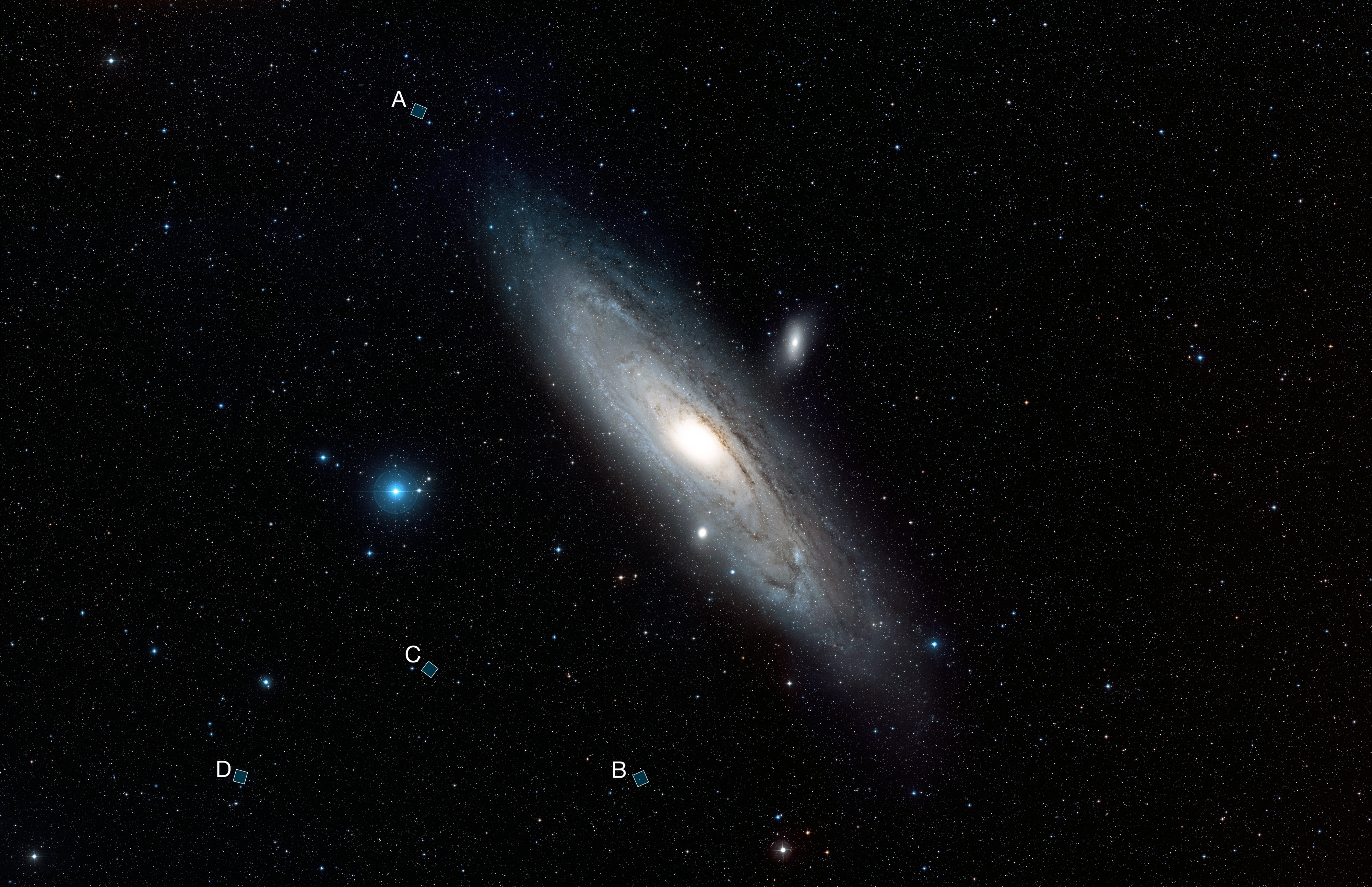 This ground-based image of the Andromeda Galaxy shows the location of four fields where the NASA/ESA Hubble Space Telescope has been used to study a wide variety of stars in the Andromeda Galaxy, ranging from faint main sequence stars like our own Sun, to the much brighter RR Lyrae stars, which are a type of variable star. With these measurements, astronomers can determine the chemistry and ages of the stars in each part of the Andromeda Galaxy.
