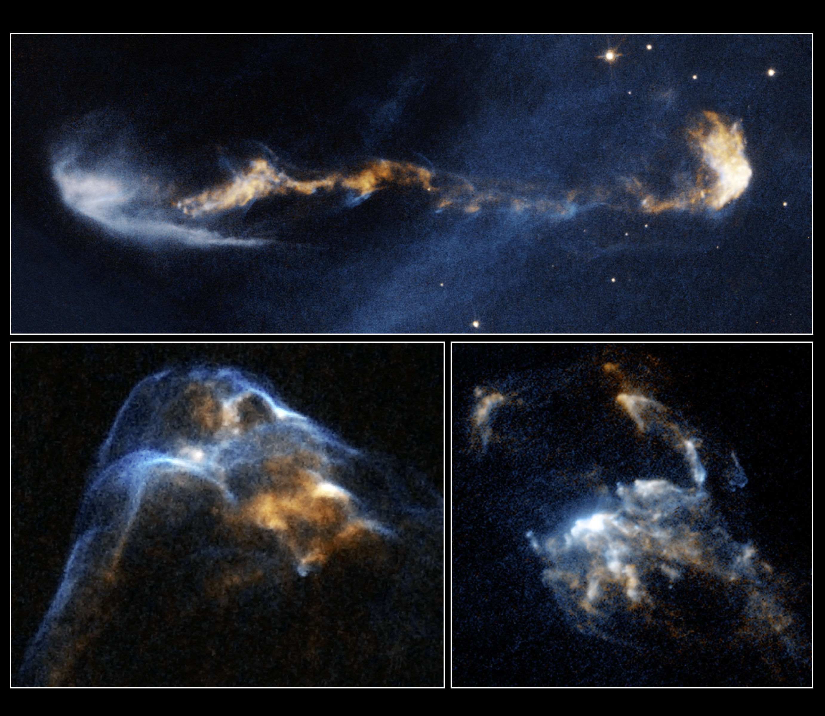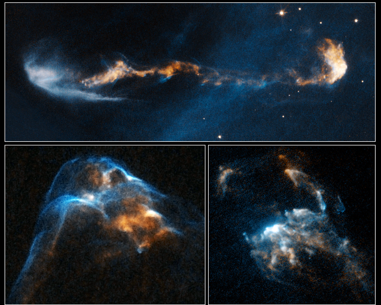 In HH 2, at lower right, several bow shocks can be seen where several fast-moving clumps have bunched up like cars in a traffic jam. In HH 34, at lower left, a grouping of merged bow shocks reveals regions that brighten and fade over time as the heated material cools where the shocks intersect.
