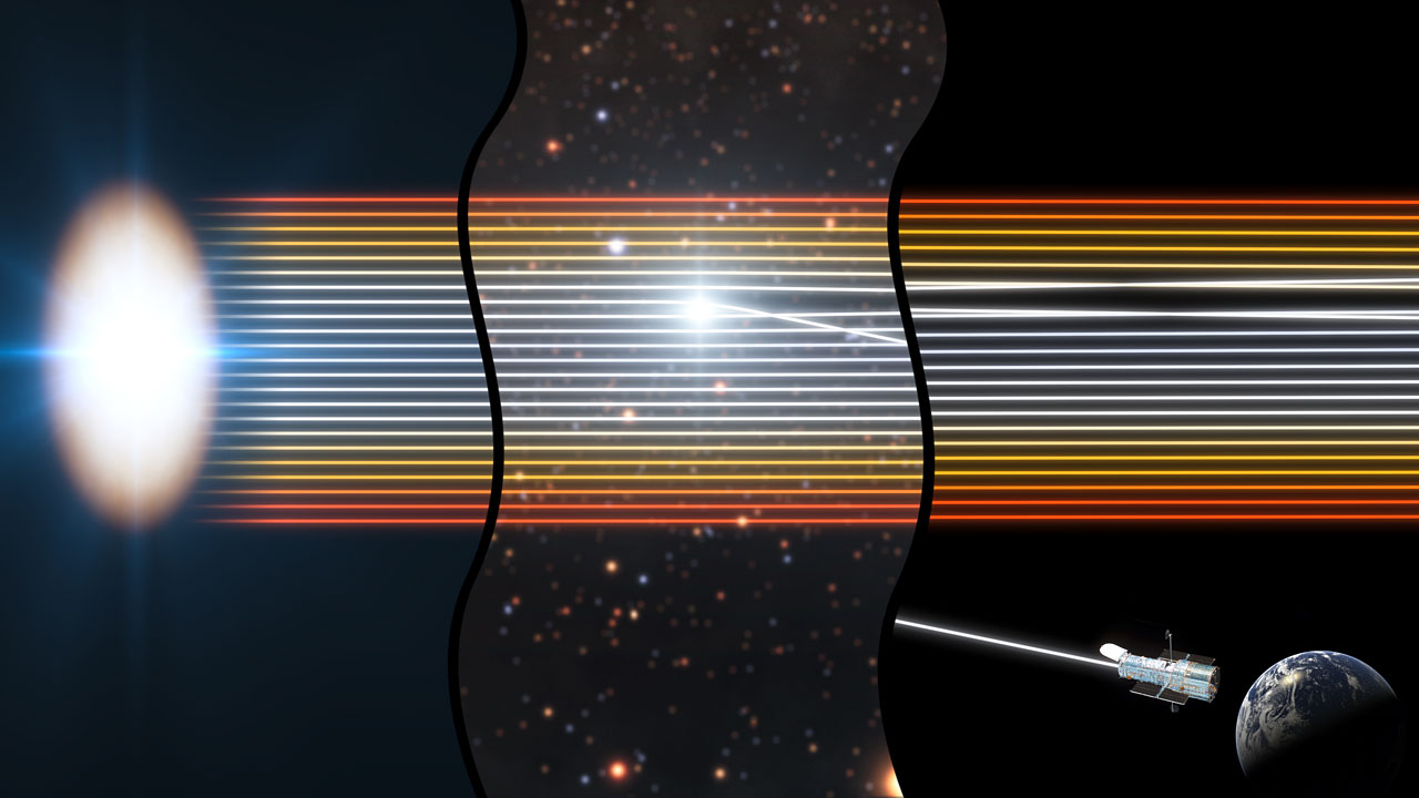 The gravity from a star in the intermediate galaxy, as it passes through the beams of light from the quasar, deflects the differently coloured beams one-by-one towards Hubble. The colours seen from Hubble therefore change over time as the star effectively scans across the quasar's disc. This lets astronomers directly observe the colour, temperature and size of the disc with unprecedented precision.